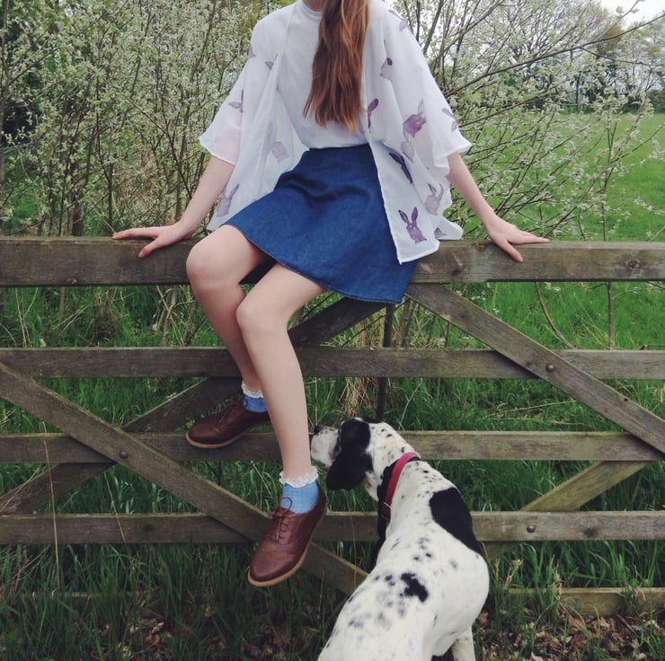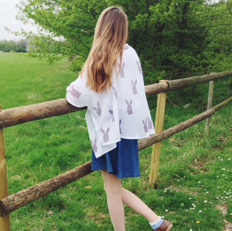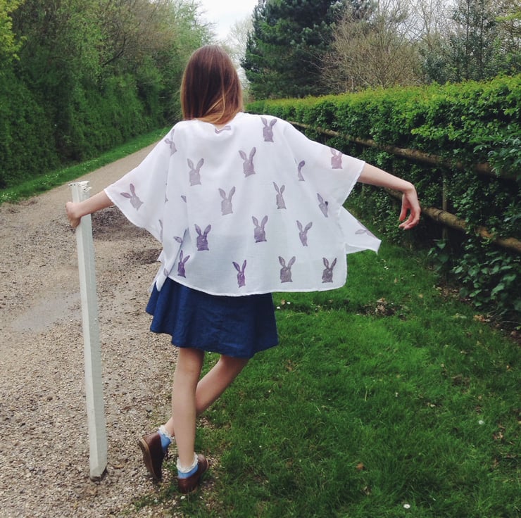 It has muted purple hares hand printed onto the fabric using Linseed oil based inks.