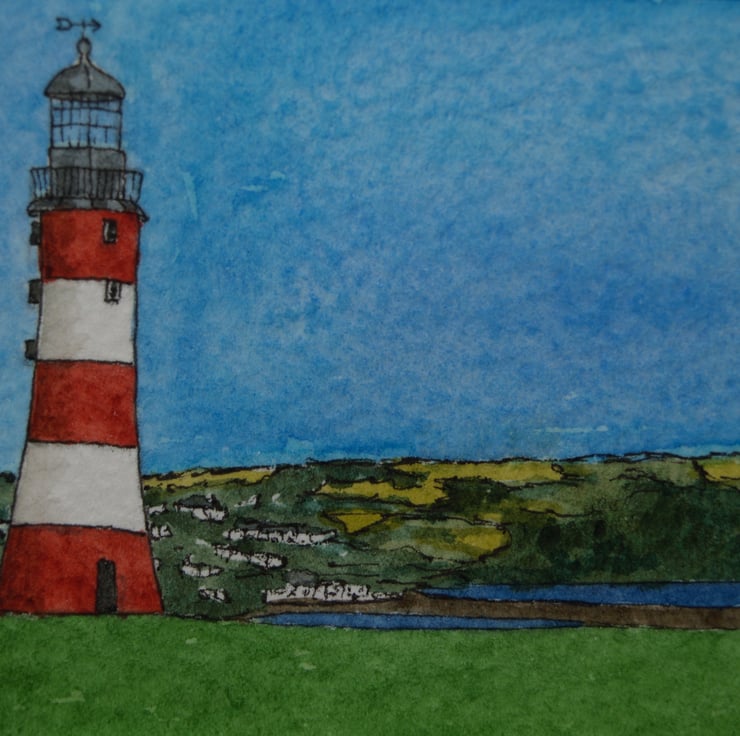 I grew up in Plymouth and love painting this lighthouse on Plymouth Hoe. This view has Staddon Heights in the background.