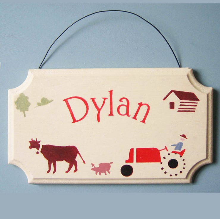 This door plaque, or hanger, is decorated with a lively farm picture, in a retro 50s style.