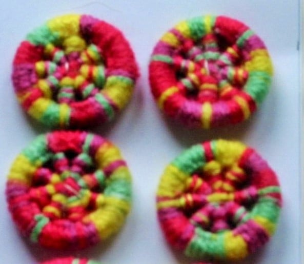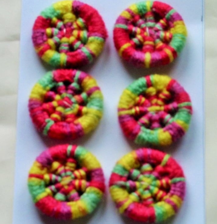 Fun and funky hand made Dorset buttons. Acrylic yarn. Washable. Easy to sew on.