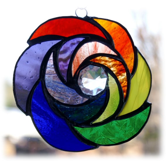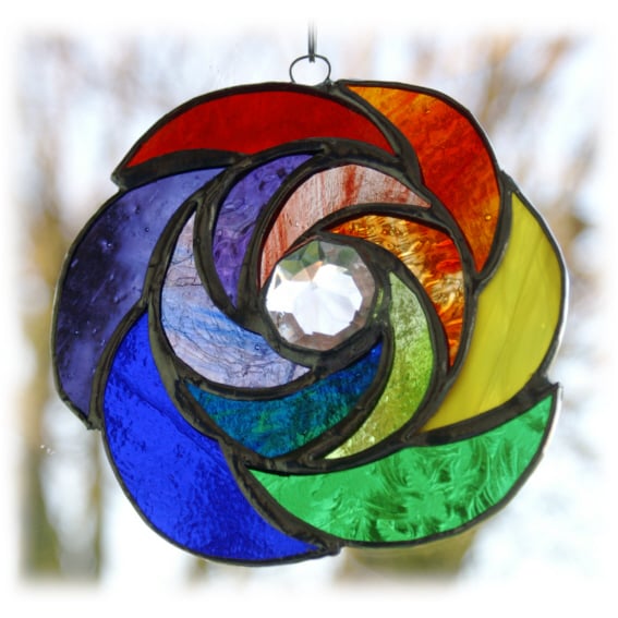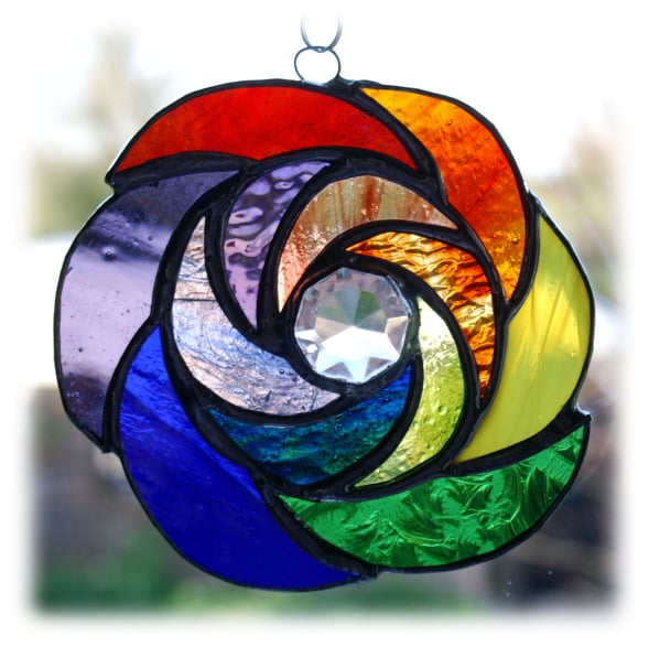 This is a stained glass suncatcher made using the Tiffany copper foil technique.