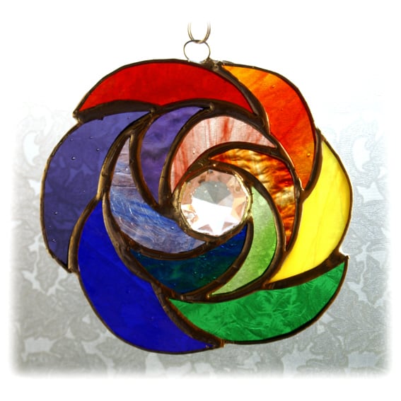 The suncatcher is 5" in diameter and hangs from a silvery chain which is securely attached by soldered little ring to the top.