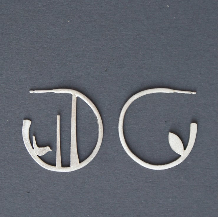 Gorgeous hoop earrings featuring stylized trees with a little bird on one side and a leaf on the other side. Soldered within a hand forged irregular open circle for an organic feel and finished with a lovely frosted texture which has a subtle sparkle and is slightly rough to the touch. Please note your earrings may vary slightly from the image as each pair is made to order.