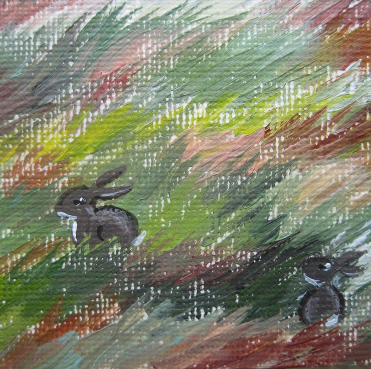This is a heathland landscape with a lone tree and two tiny wee bunny rabbits. It is painted in acrylics on acrylic paper.