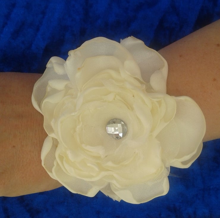 A beautiful cream coloured flower corsage that can be worn on the wrist, on clothing, in the hair or on a bag/accessory.