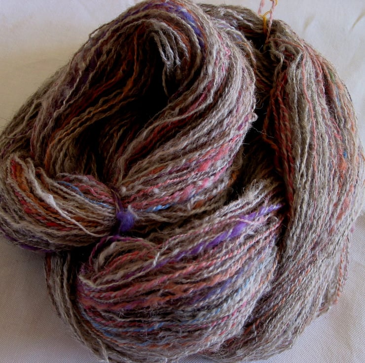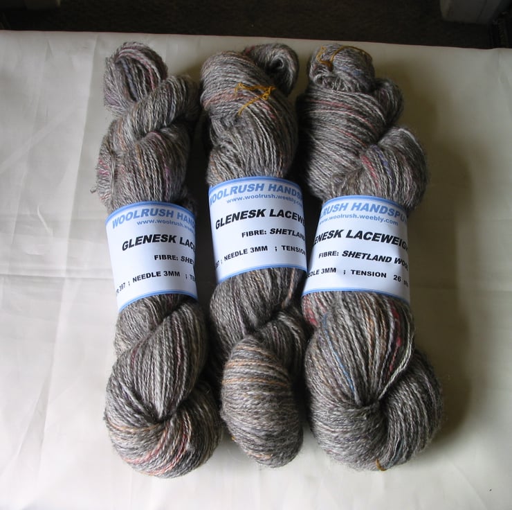 Glenesk handspun laceweight wool in shade 'Evening' makes a beautiful and totally unique project. Spun from undyed Shetland wool, spun through randomly with colours suggested by the evening sky,each skein is slightly different.