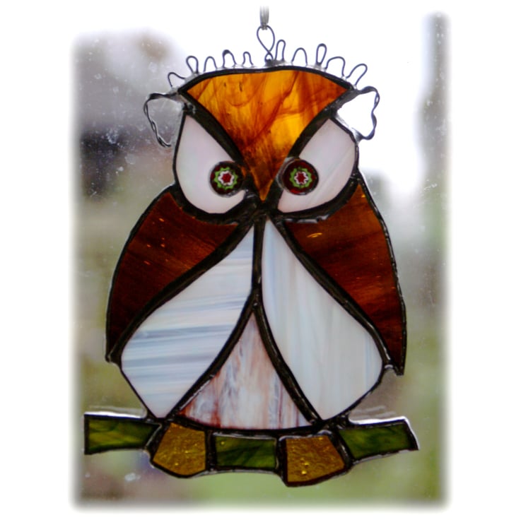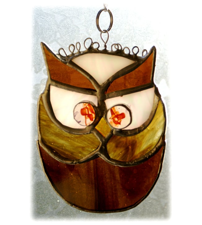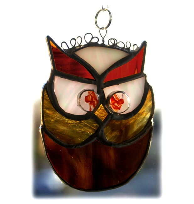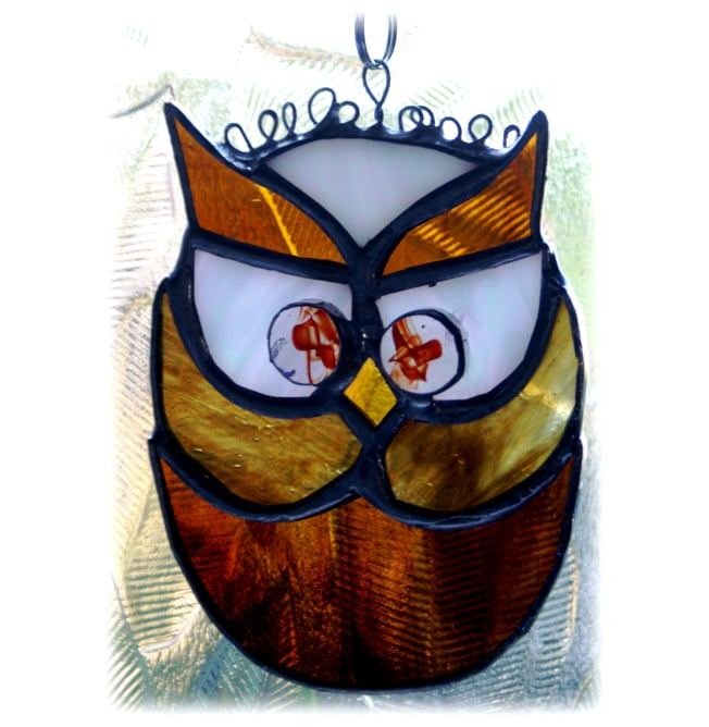 This suncatcher, my smallest owl and latest owl design, is 4 inches tall and 3 wide.