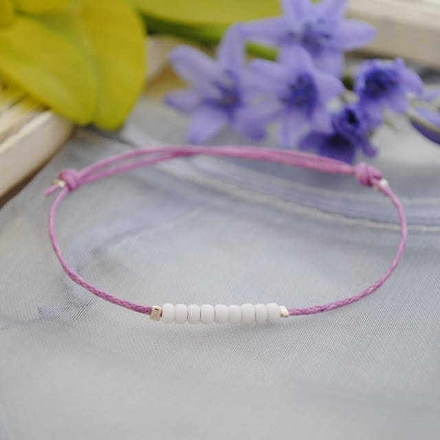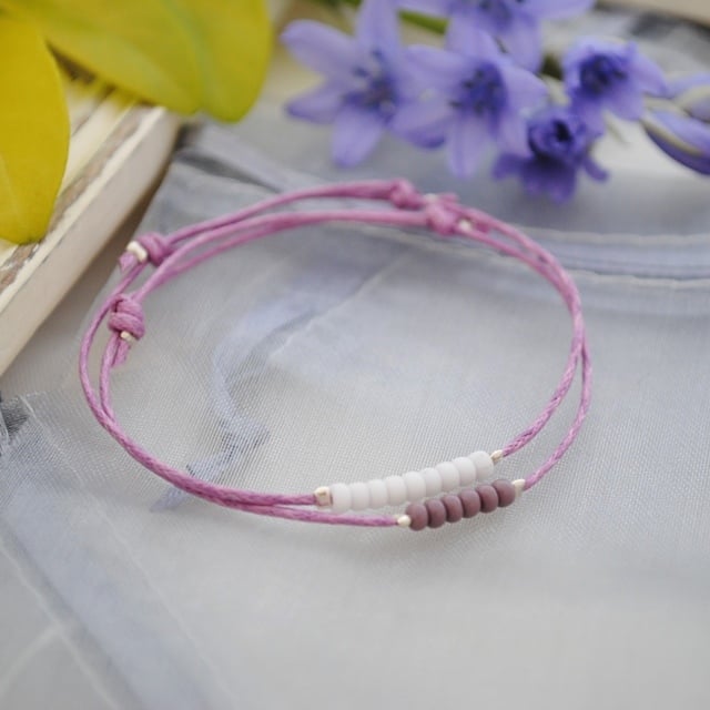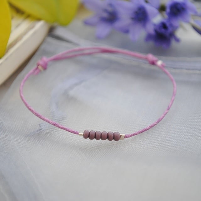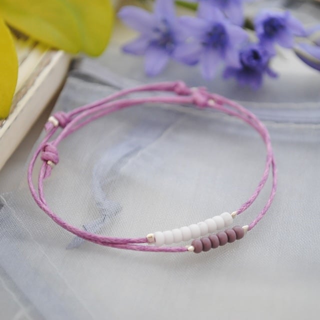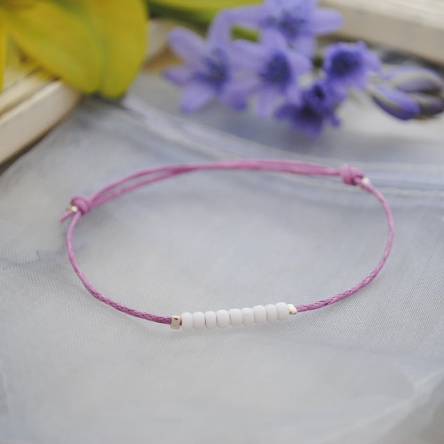 A set of two simple cord friendship bracelets made with violet waxed cord. One bracelet features white seed beads and the other purple seed beads. Both bracelets are finished with silver beads.