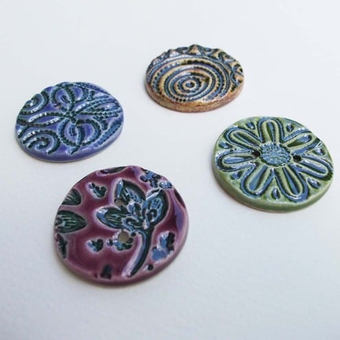 This set of four buttons are made from white earthenware clay, embossed and glazed to 1100 degrees, so nice and strong.