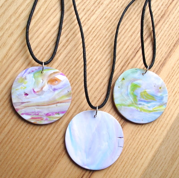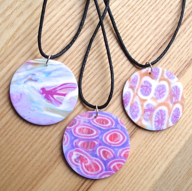 These funky pendants are a circle shape made from polymer clays. They are at a special price as the backs of the pendants cracked during baking, shown in final photo. The fronts are fine and worthy of being shown off. They have been lightly sanded and buffed and strung on strands of black cotton cord, fastening with tibetan silver heart toggle clasps. Cord length is 18 inches.