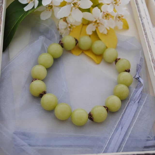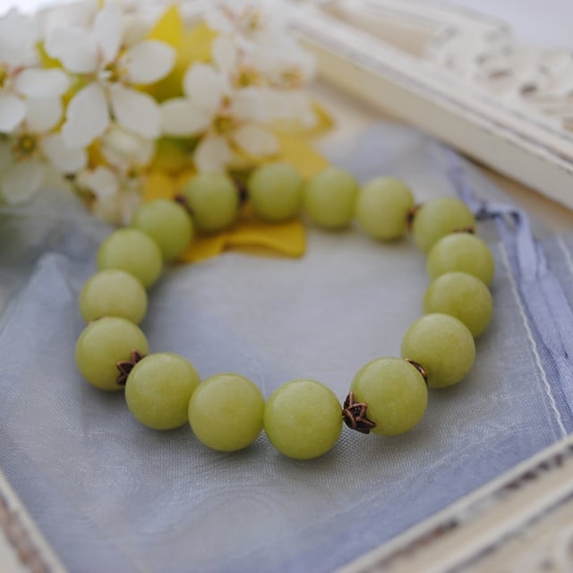 The stretch bracelet is made with 12mm green jade beads with copper bead caps used as spacers to add interest and texture. The bracelet is suitable for medium to larger wrist sizes with a length of 8 inches / 20 cm.