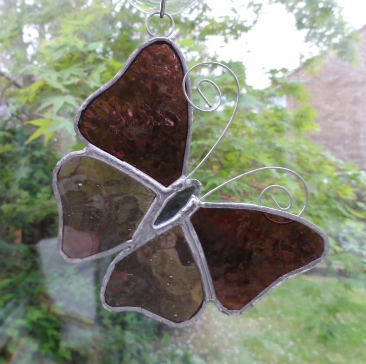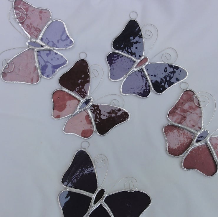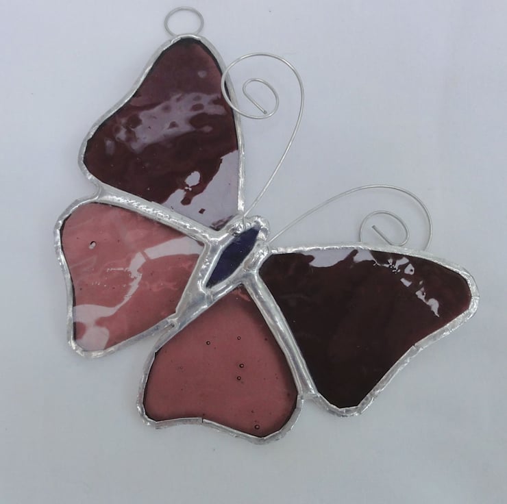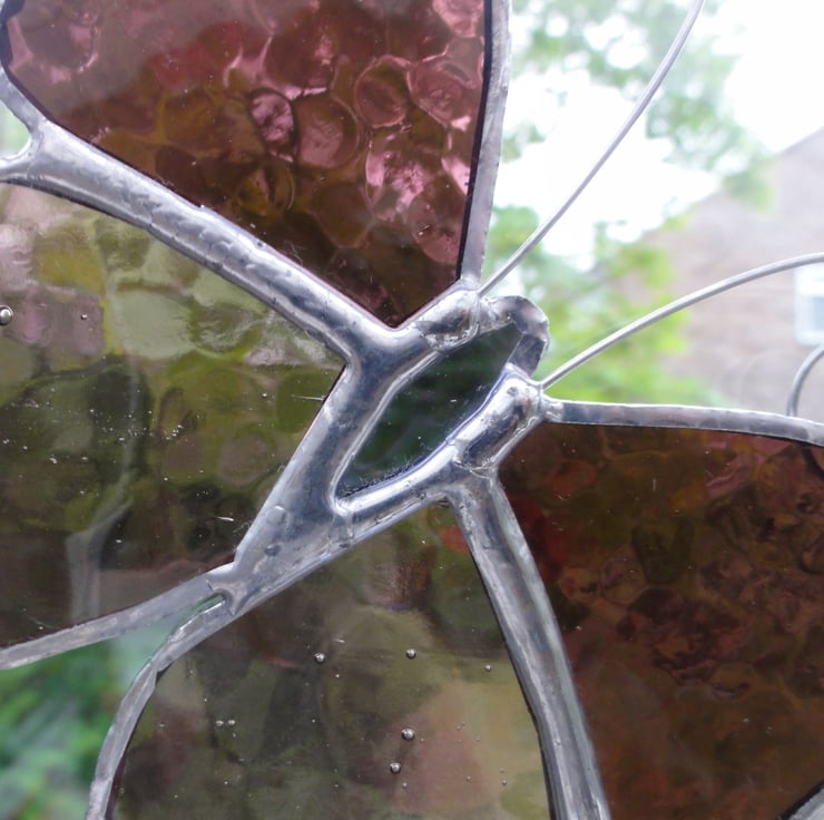 The glass used in this suncatcher is dark pink corella glass and rose pink textured glass for the wings and mauve glass for the body.