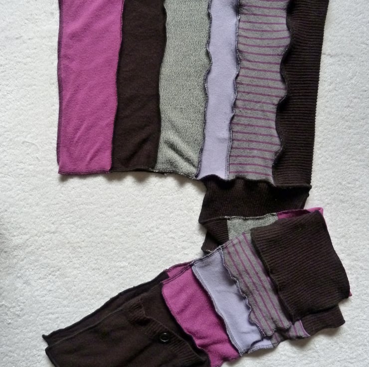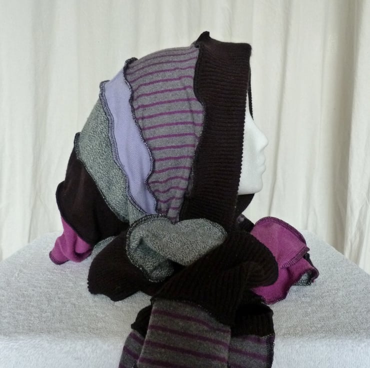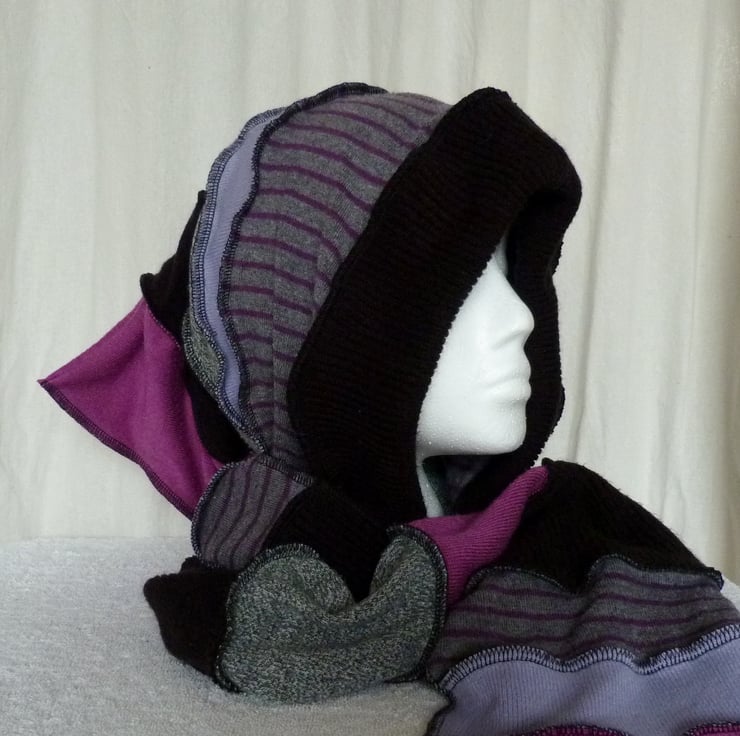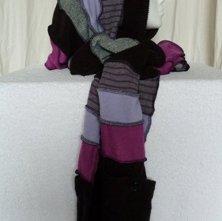 I have created this fantastic up-cycled scoodie from a selection of mixed fiber jumpers. These are previously loved and recycled jumpers, that I have washed in a hot temperature and pre-shrunk. I have then cut and re-stitched the jumpers, with all seams being professionally finished with a serger/overlocker, to create this fabulous scoodie.