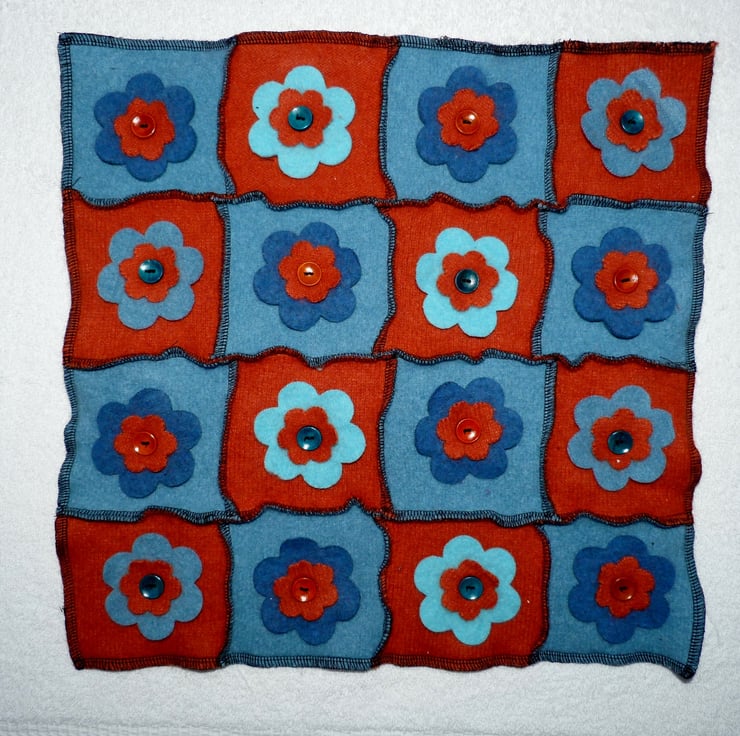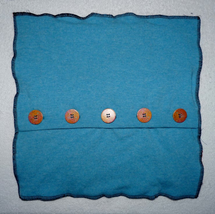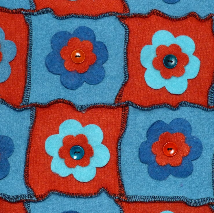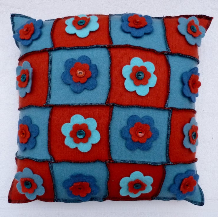 I have created this funky up-cycled cushion cover from a patchwork of up-cycled felted jumpers.These are previously loved and recycled jumpers, that I have washed in a hot temperature and pre-shrunk. I have then cut and re-stitched the jumpers, with all seams being professionally finished with a serger/over-locker, to create this fabulous cushion.The jumpers are really soft and cosy, and have been carefully selected from cashmere and angora jumpers in shades of brown and teal for the patchwork squares. I have then cut flower shapes from contrasting colours, and attached them to the cushion with wooden buttons