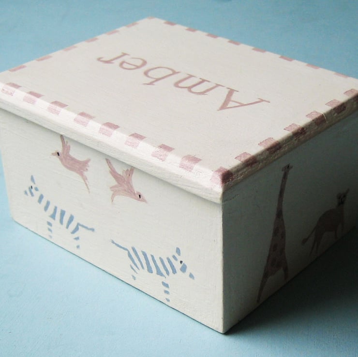 This small keepsake box is decorated in the popular Noah's ark theme in contemporary neutral colours. It makes a unique Birthday or Christening present. It is hand painted to order, and can be personalised with any name of your choice.