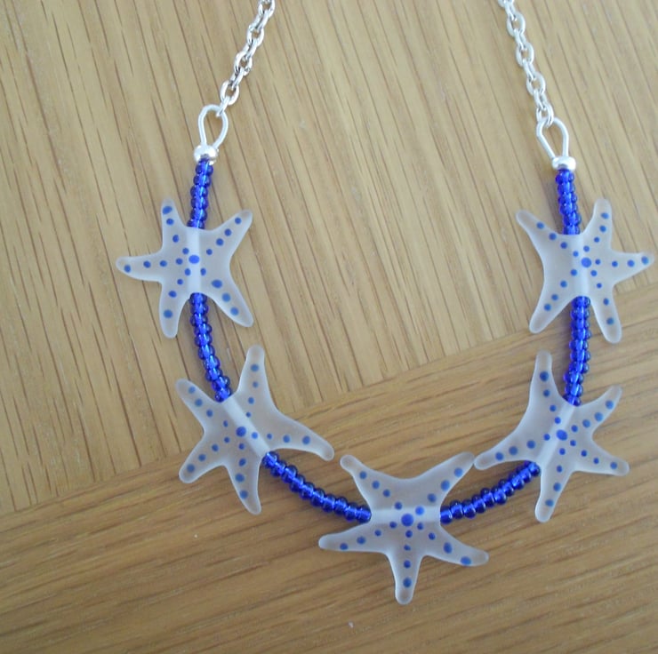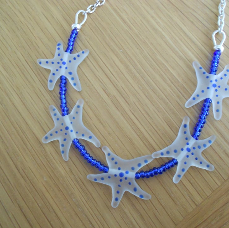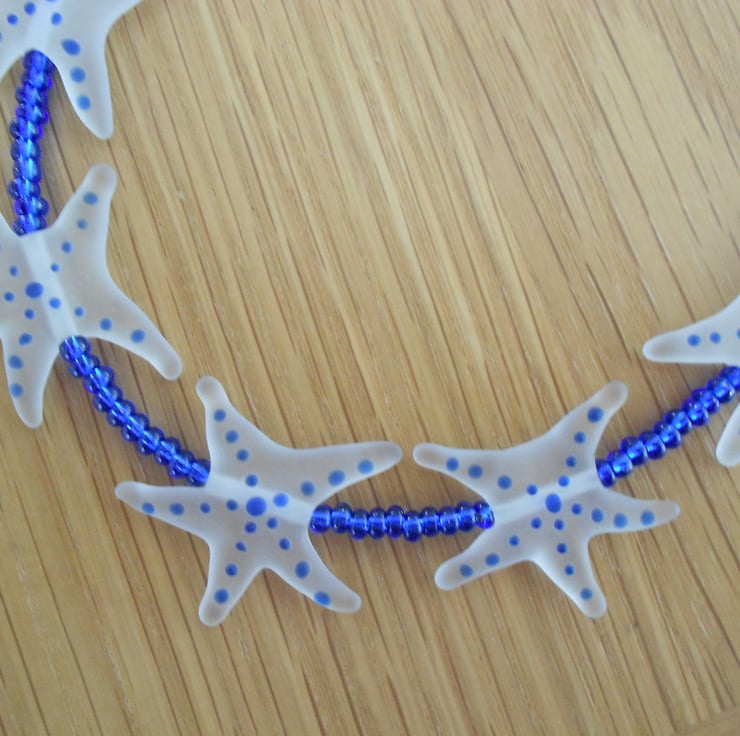 This is a lovely necklace made from opaque glass starfish with cobalt blue dots on them. The starfish measure 1" across. The necklace is finished with cobalt blue seed beads and silver plated chain. The measuremennt is 48cm (19") and fastens with a silver toggle clasp. As all of the items in my shop are individual pieces made by myself this is the necklace you will receive. It will arrive gift wrapped in tissue paper and a organza bag.