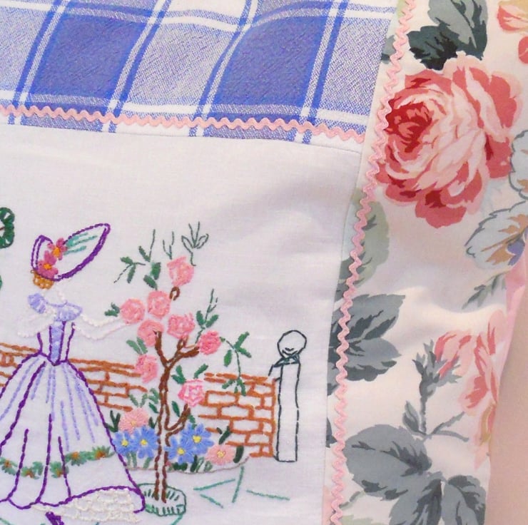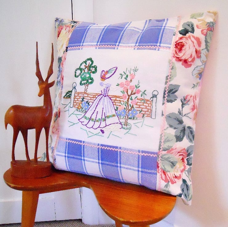 A fabulous 50cm 18 inch cushion cover featuring genuine vintage embroidered linen - this has been lightly interfaced , lined with cotton and the stitching renovated to support and enhance this lovely work.