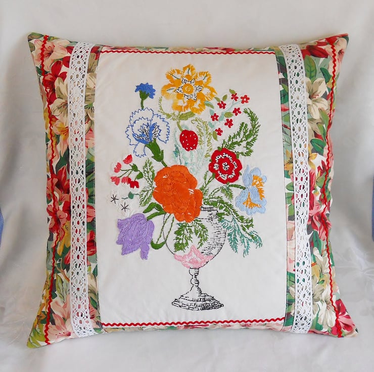 A fabulous 50cm 18 inch cushion cover featuring genuine vintage embroidered linen - this has been lightly interfaced , lined with cotton and the stitching renovated to support and enhance this lovely work.