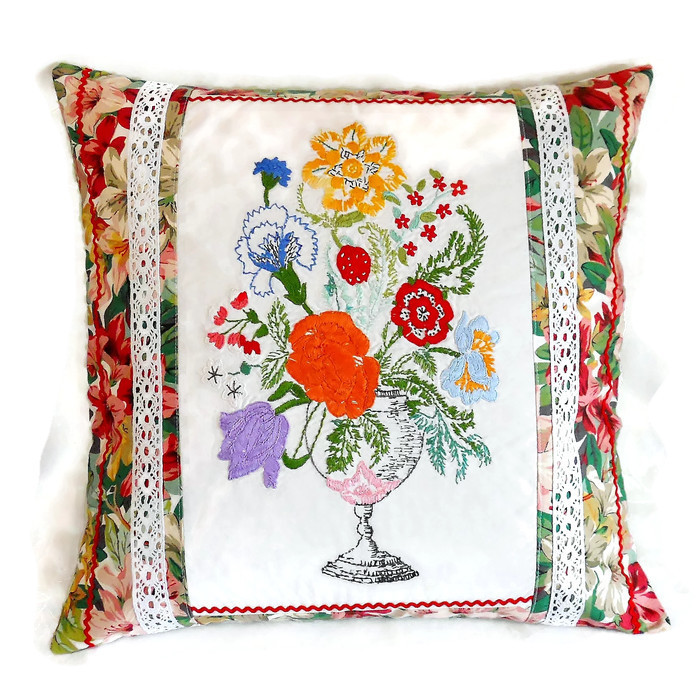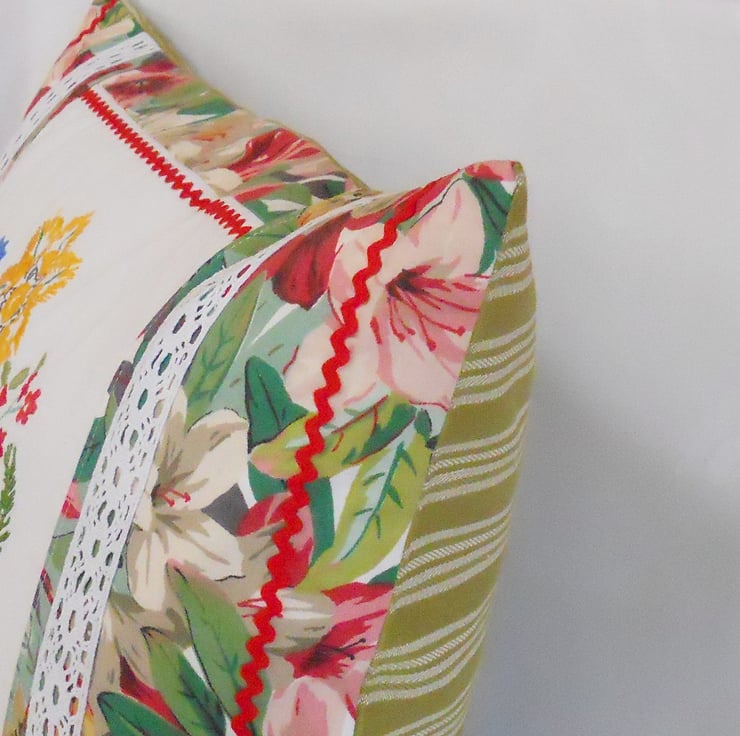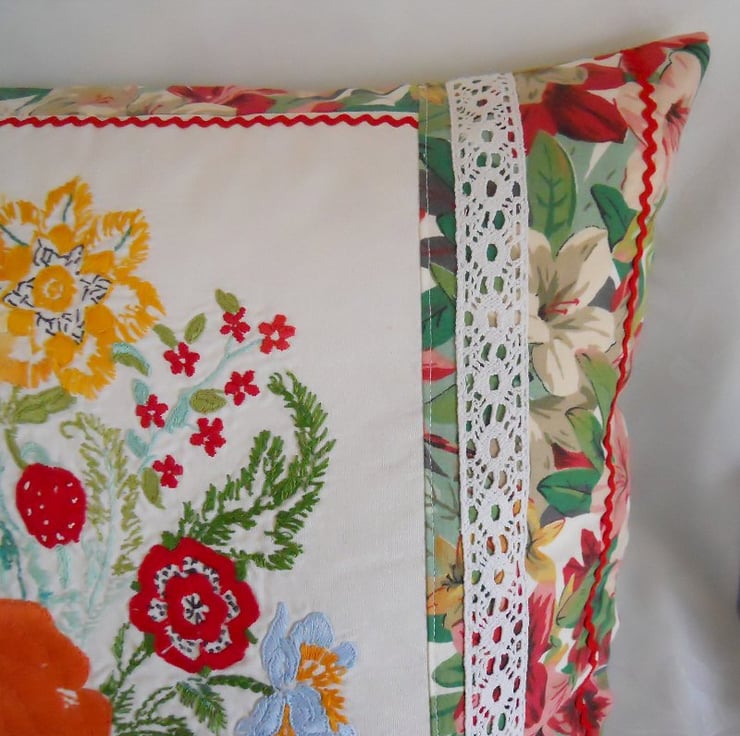 A fabulous 50cm 18 inch cushion cover featuring genuine vintage embroidered linen - this has been lightly interfaced , lined with cotton and the stitching renovated to support and enhance this lovely work.