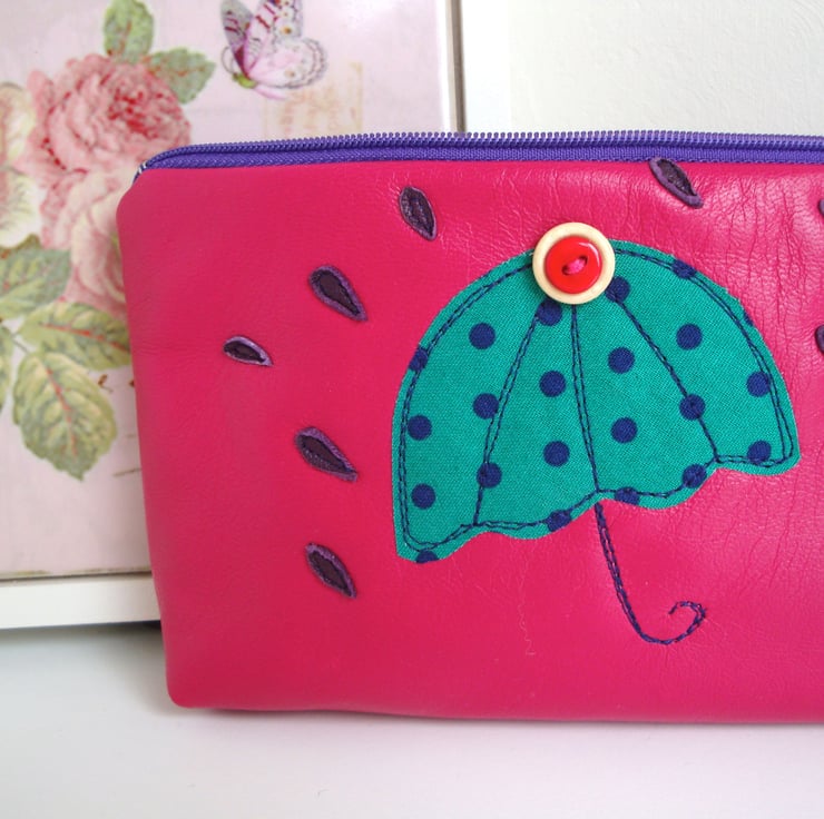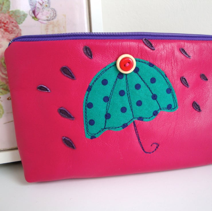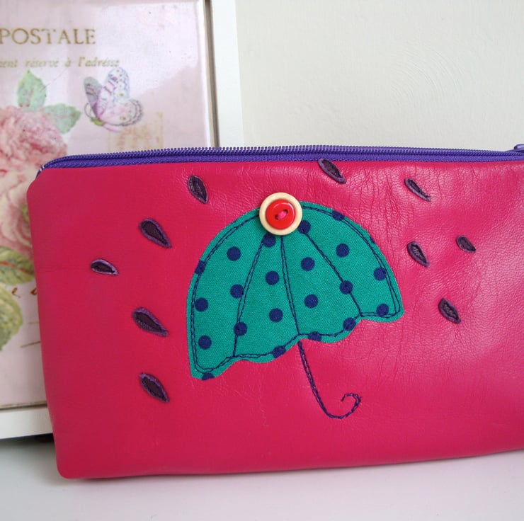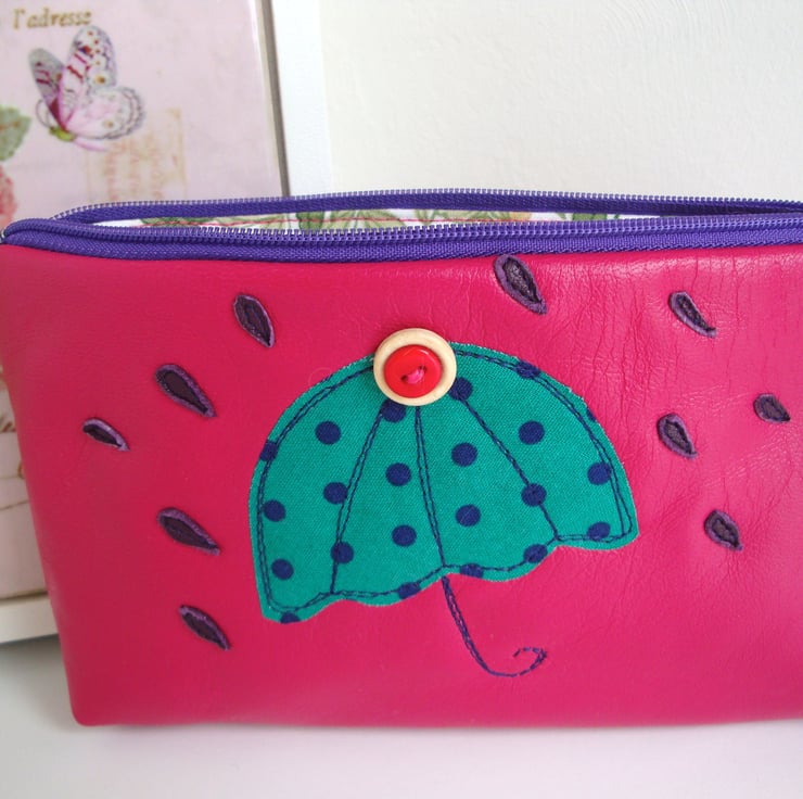 A funky zipper Make up bag /Pencil case - made in a raspberry pink soft leather .