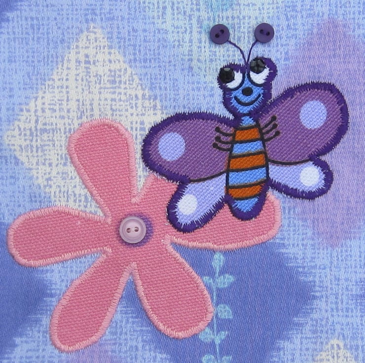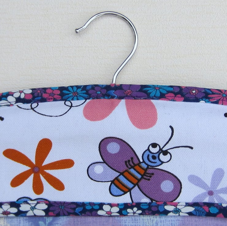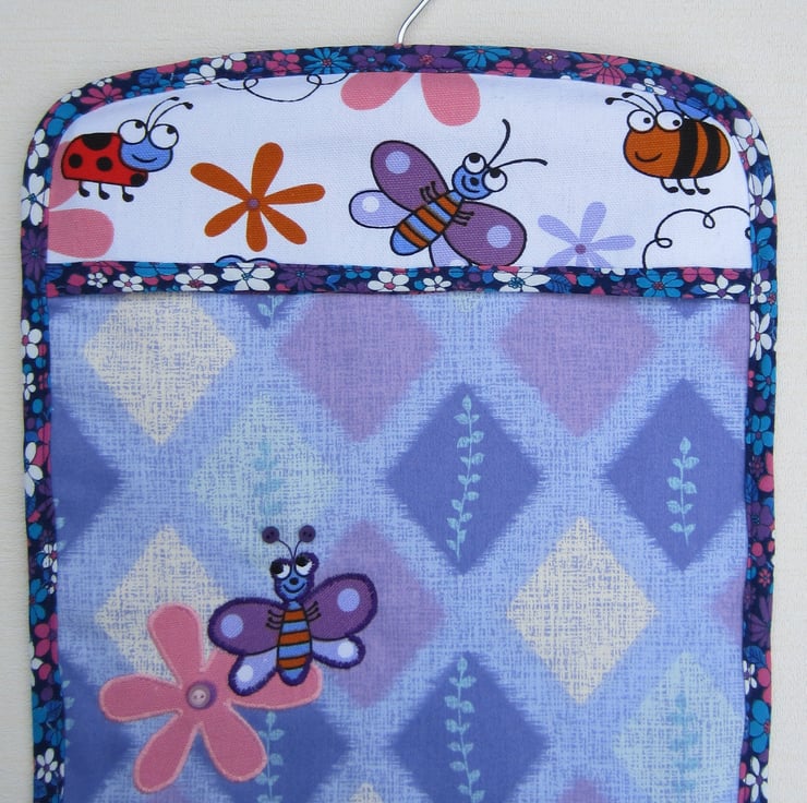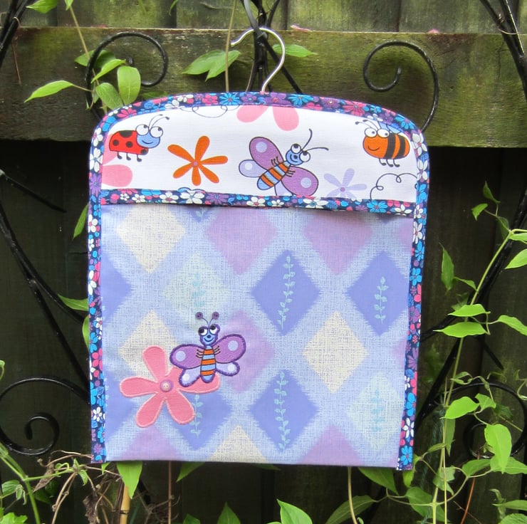 Lilac patterned peg bag appliqued with a flower and butterfly. Buttons and sequins added to applique. Edged with floral bias binding and lined with the same lilac patterned fabric. Plenty of room for lots of pegs, it measures 30 cm wide and 33.5 cm long. Also useful for other storage such as lingerie, socks etc. Hangs with a strong wooden coat hanger.