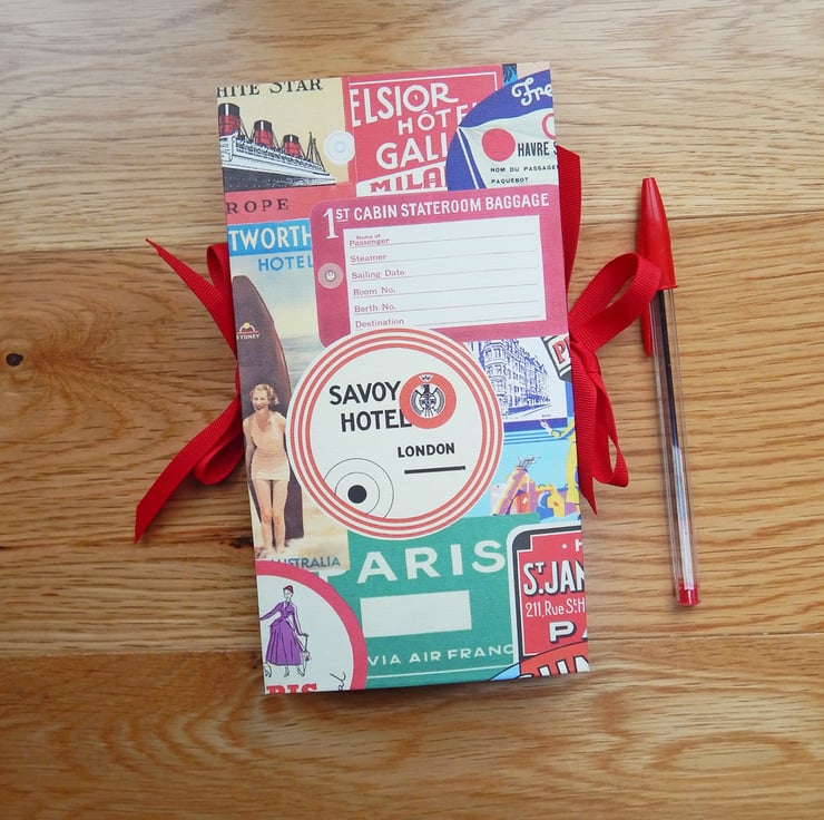 - The book has hard covers of book board, in a lovely paper with a collage design of vintage trunk labels.