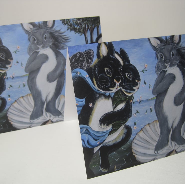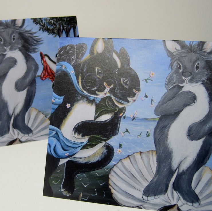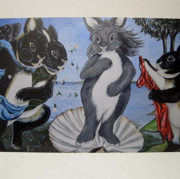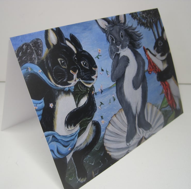 A blank greetings card (one), featuring a print of one of my original paintings which was a rabbit version of Botticelli's 'Birth of Venus'.