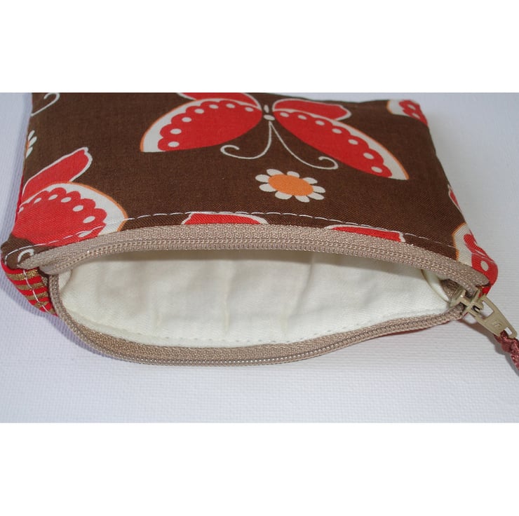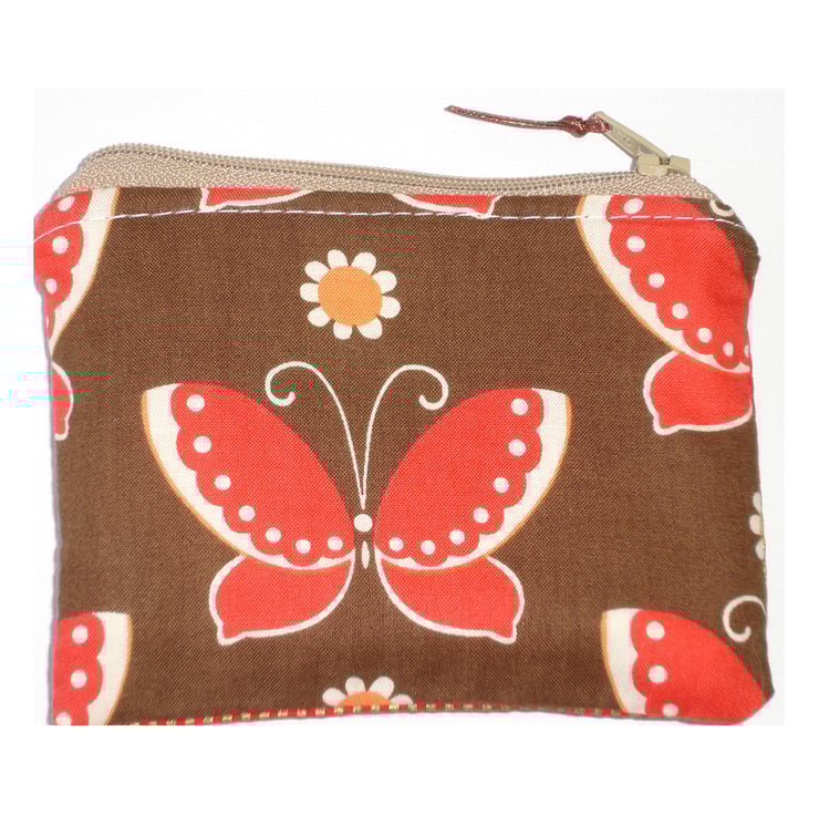A Zipped Coin / Credit Card Purse in a vintage 1970's Cotton Fabric - Red and Orange Butterflies on a Chocolate Brown Background.