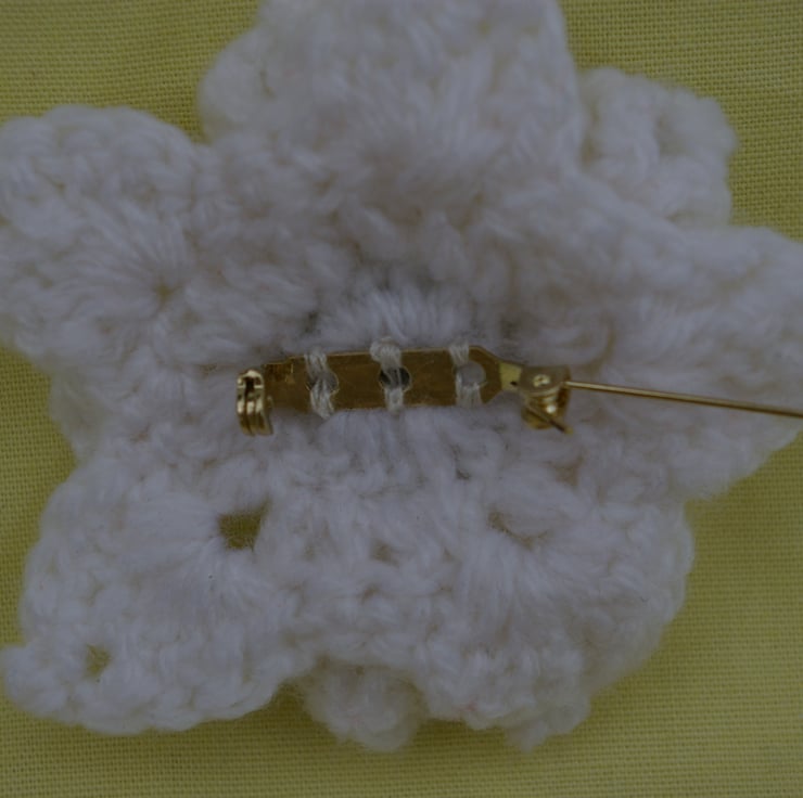 On the back of the flower brooch is a Safety Brooch Pin. The brooch pin is gold in colour. This has been hand sewn onto the back of the flower brooch.