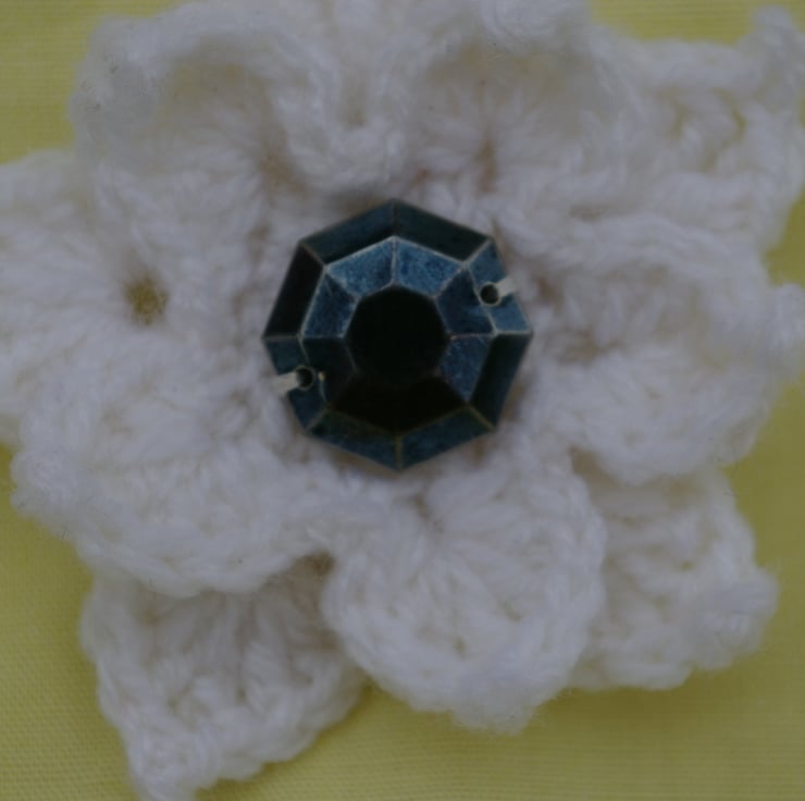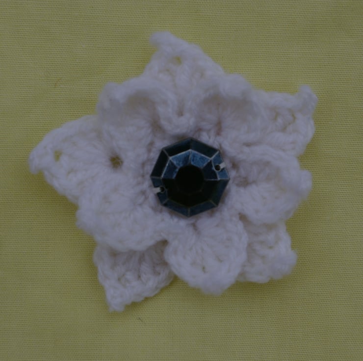 A lovely, crochet flower, brooch. This little brooch has been hand crocheted in two layers of five petals. Both layers are white in colour and the yarn used for this flower brooch is soft acrylic yarn.