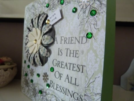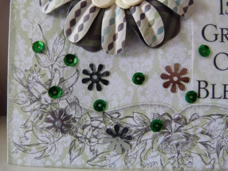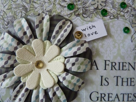 A pretty flower consisting of four layers of die cut petals in co-ordinating colours of pale green and cream mounted onto a pale green romantic patterned paper and then onto quality white card. Embellished with a vellum saying, green sequins, silver flower sequins and a with love tag finished off with pale gold rhinestones.