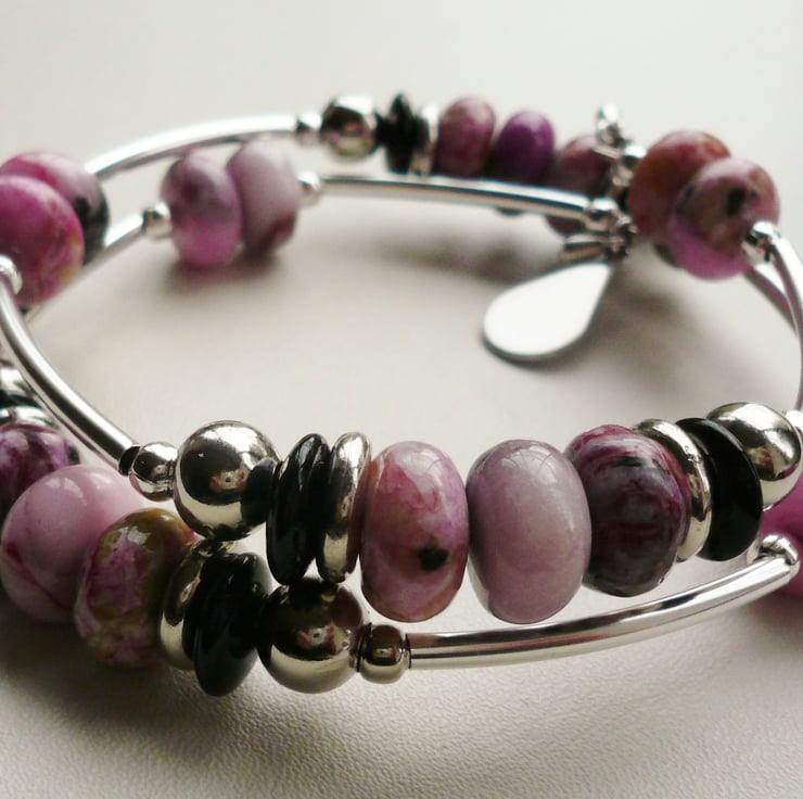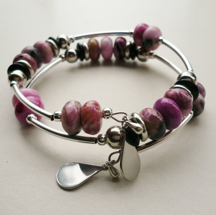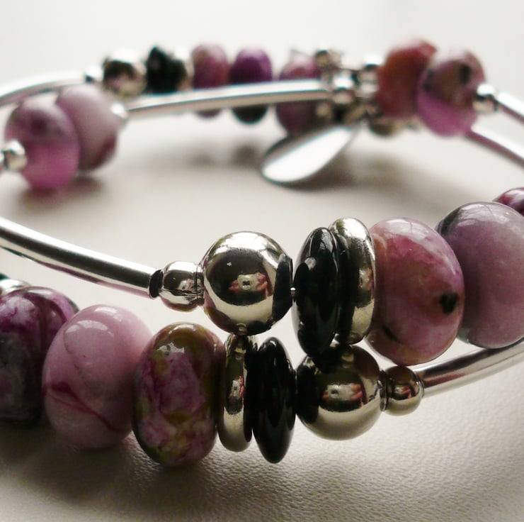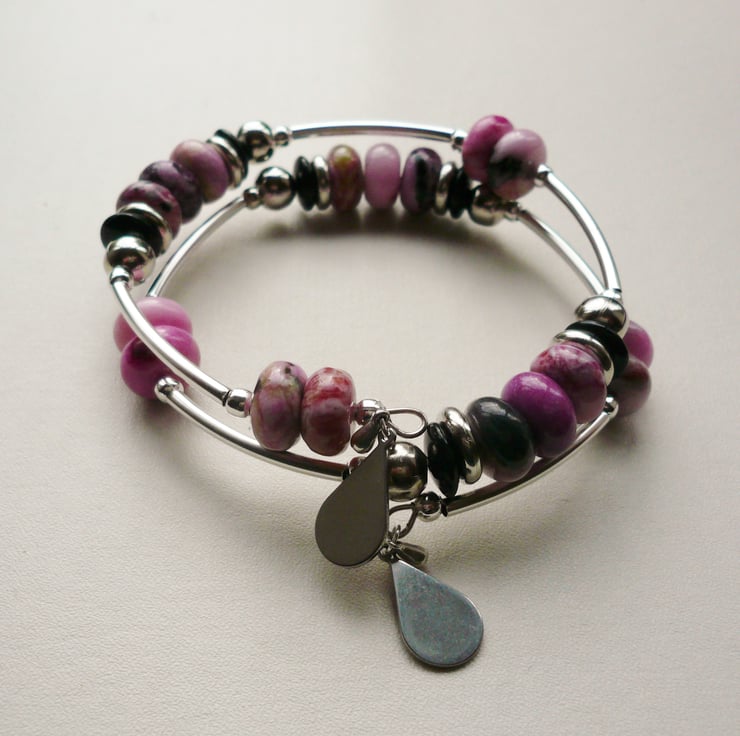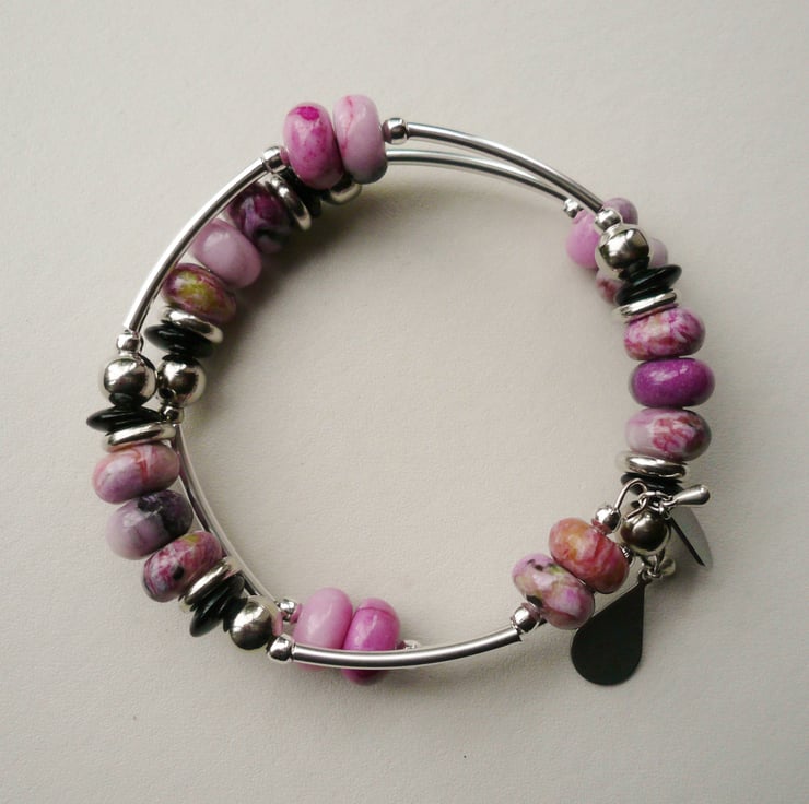 This bracelet is made up of pretty 10mm dyed pink Spider Web Jasper beads, 8mm black glass rondelle beads mixed with 8mm round and 10mm ring spacers and long thin tube spacer beads. These have all been threaded onto two coils of silver plated memory wire and finished off with 15mm long flat drop discs and 6mm drop beads in Tibetan silver at each end.
