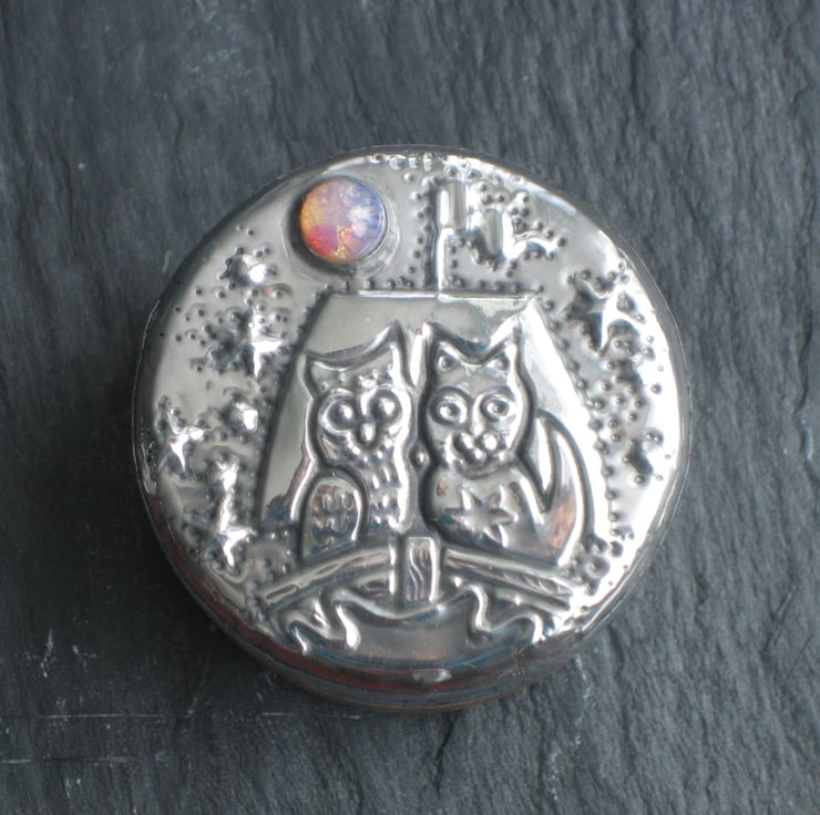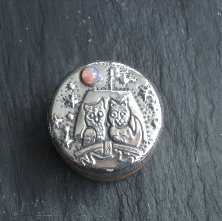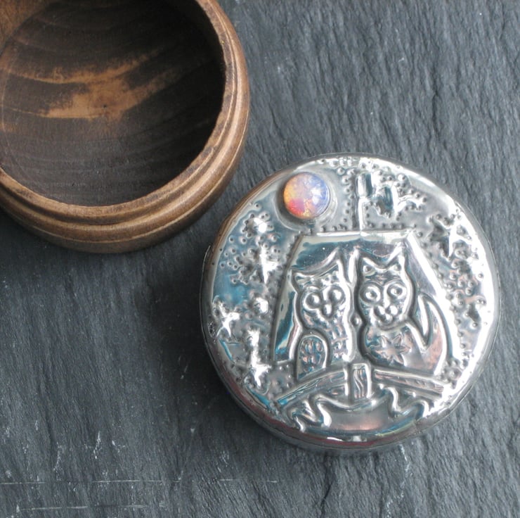 This little rustic wooden box has been transformed with a lid of hand-crafted pewter. The romantic duo sail beneath a moon of sparkly synthetic opal. The box measures 39mm (1.5ins) across and is 30mm(1.25ins) high.