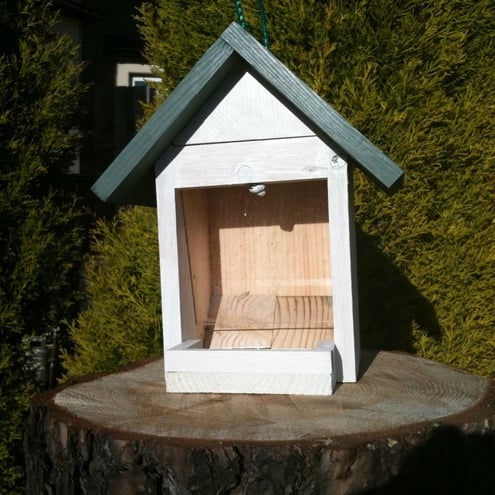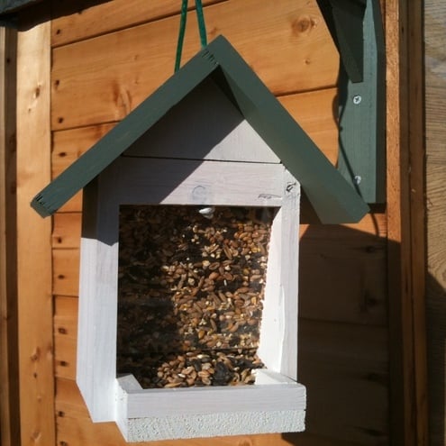 This is a great little bird feeder for attracting the birds to your garden. Filled through the removable roof, the bird food then gravity feeds down as the birds eat. Holds about 2 cups of food.