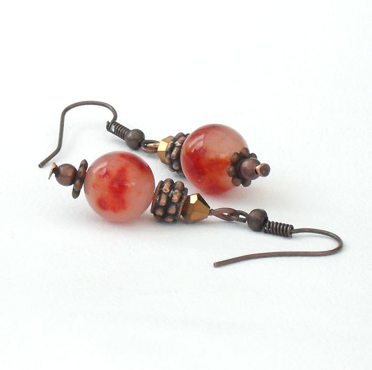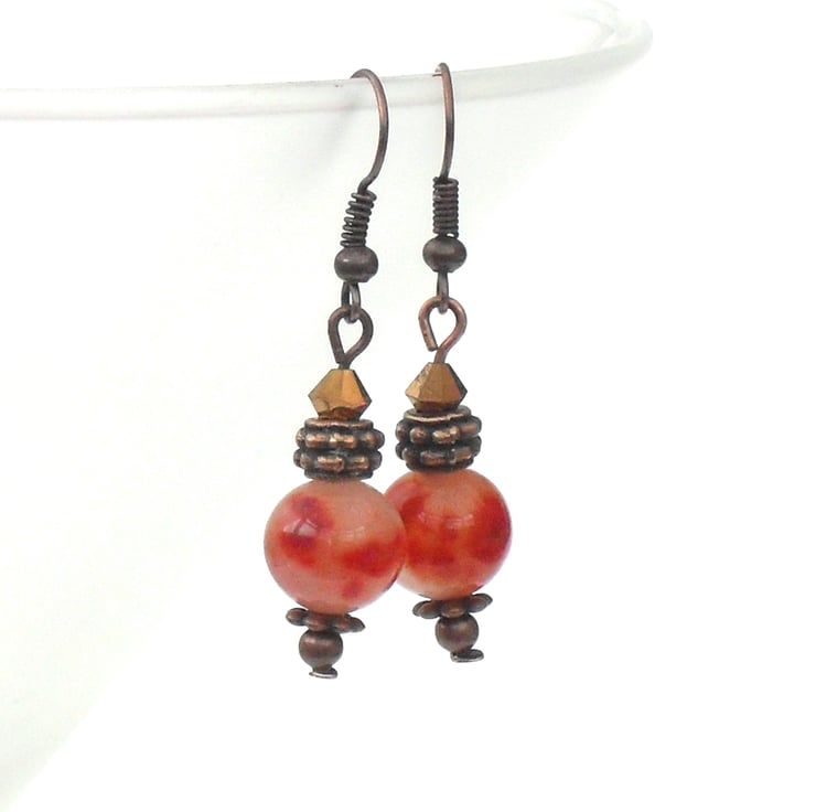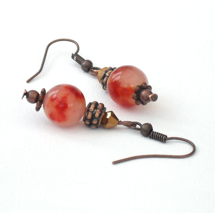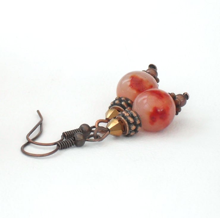 The gemstones hang on copper wire with golden metallic crystals. I have added ornate copper spacer beads to add detail to these one-of-a-kind earrings.