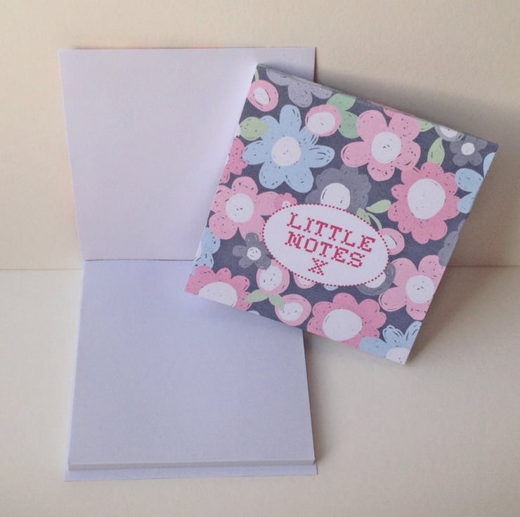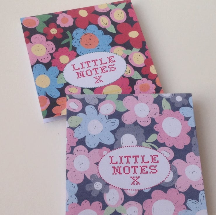 The pretty, bright floral printed cover is top quality card with a little message on the front - Little Notes and Mini Notes in a cross stitch font.