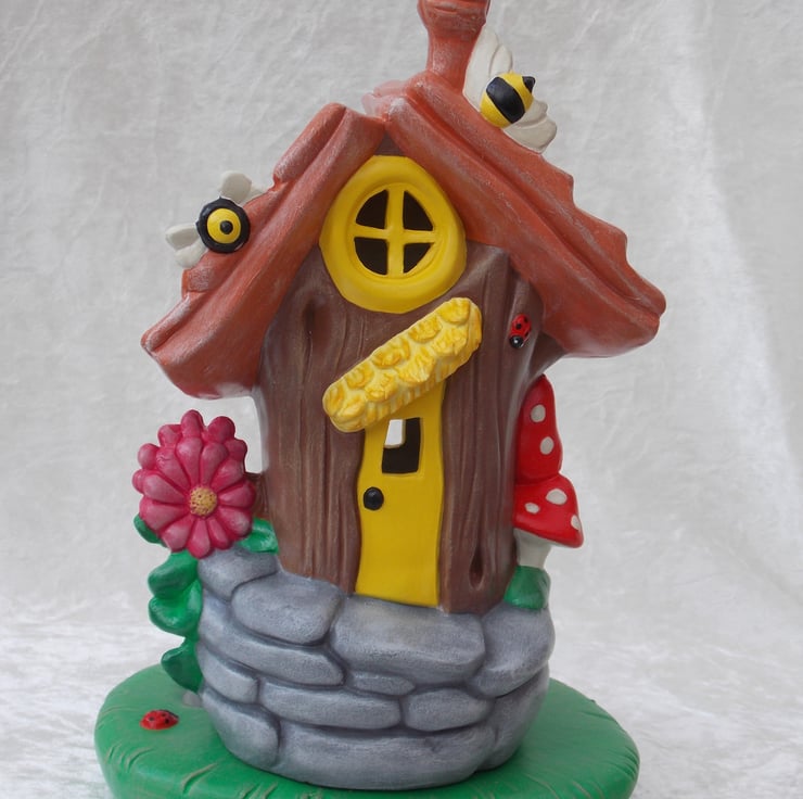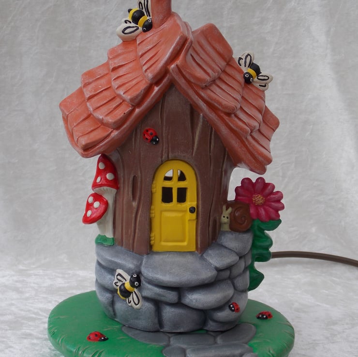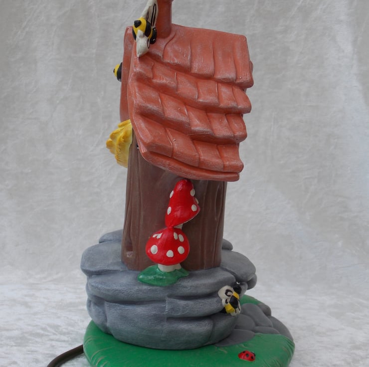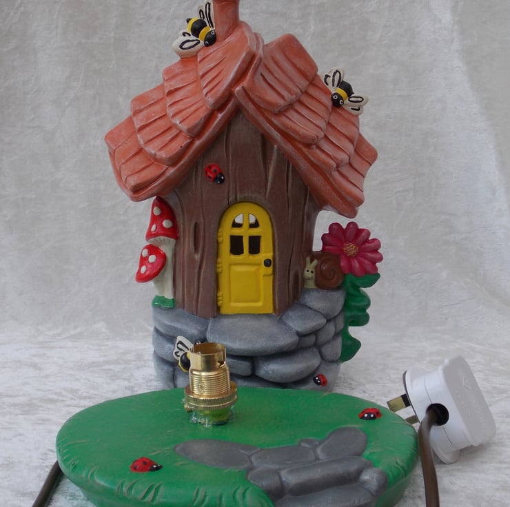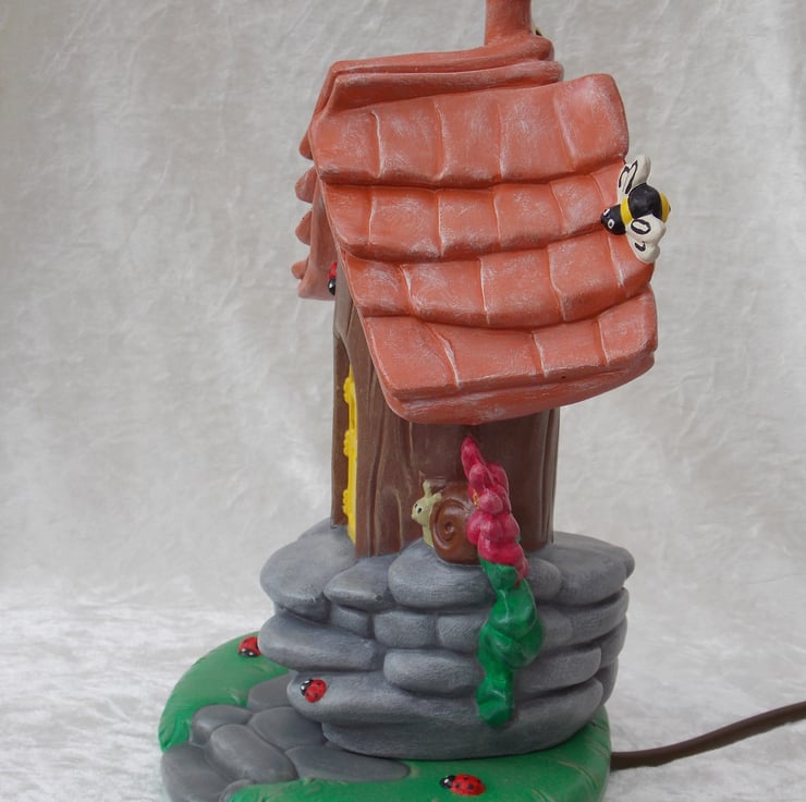 I have for sale a ceramic table lamp, which was hand painted by myself. It is a woodland bumble bee house and garden, with a snail, pink flowers, toadstools, ladybirds and of course, bumble bees. The house and garden are completely separate, with the electrics in the base. Included in the sale you have a choice of either, a clear pygmy bulb or a flicker bulb, this flickers and has a red glow, please message me which type you would prefer. PLEASE NOTE: the plug will be supplied, but it will NOT be fitted. This would make a lovely addition to any one's home or perhaps given as a gift.