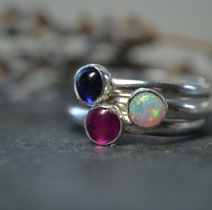 Three handmade sterling silver rings, each holding a 5mm gemstone in a silver setting. These rings stack beautifully together.
