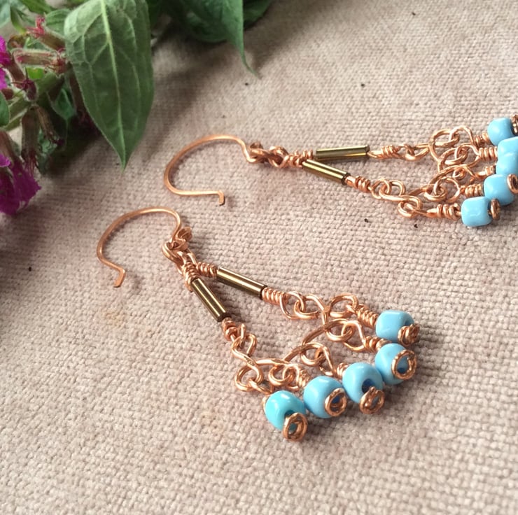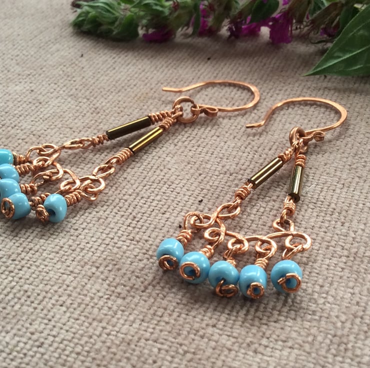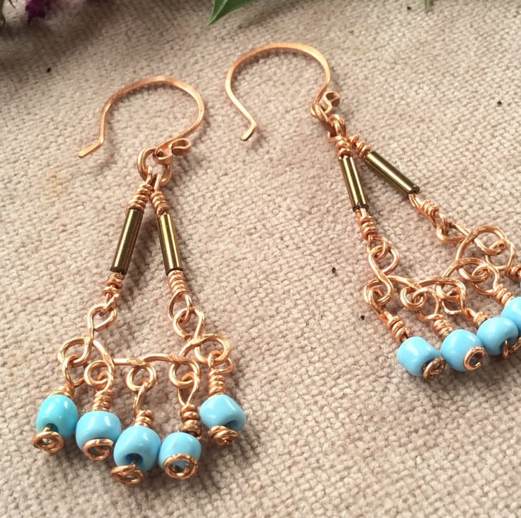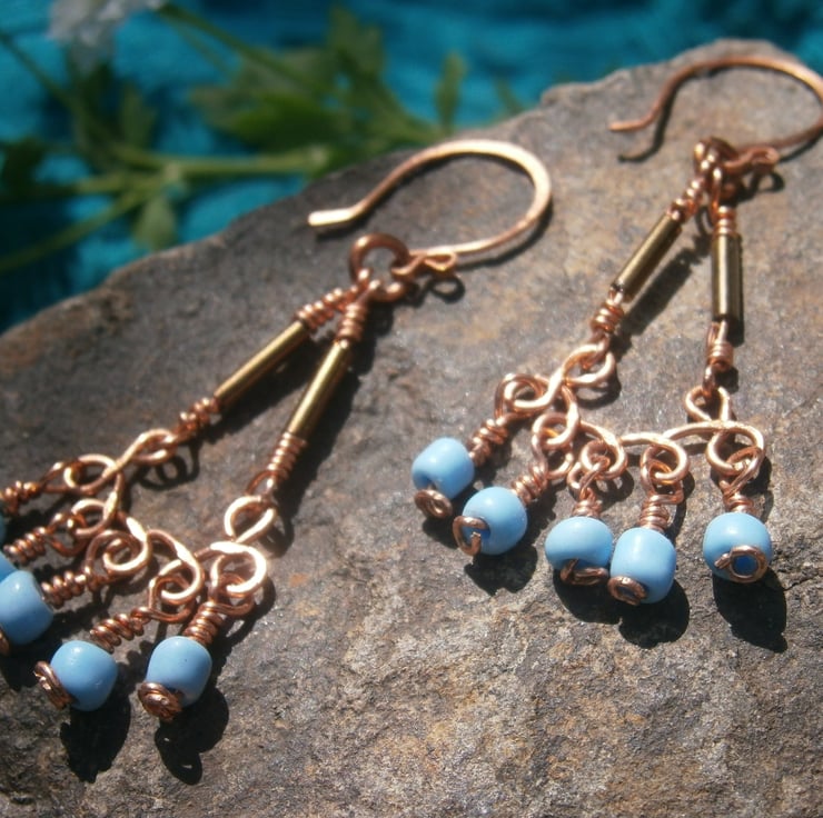 Beautiful wire and bead, chandelier style copper earrings. Hand twisted loops of wire, suspended with wire wrapped matte powder blue seed and bronze bugle beads, with hand forged ear wires.