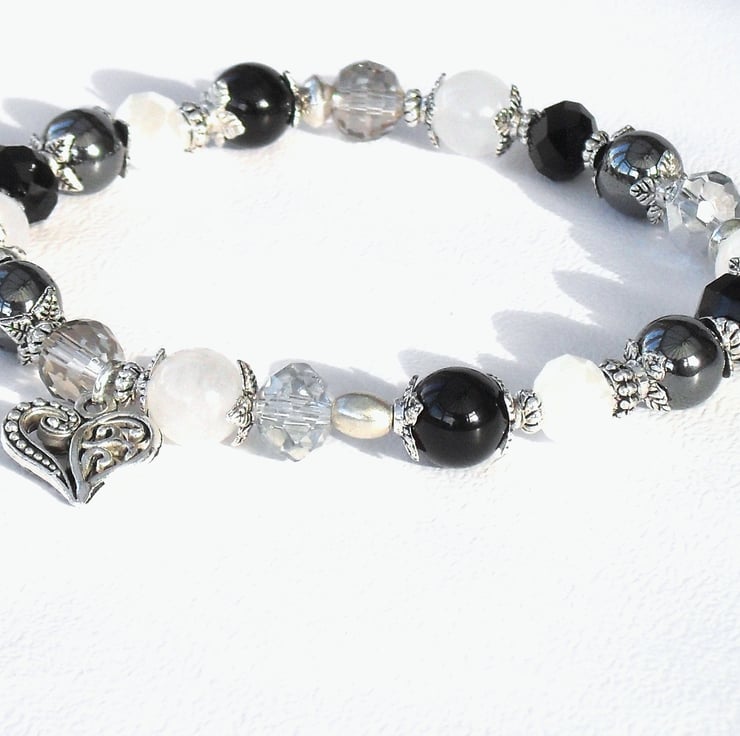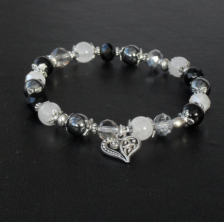 This versatile bracelet is made with a carefully selected mix of gemstones - onyx, jade and hematite, and sparkly silver, grey and white crystals. I have used a variety of silver coloured spacer beads to add contract and interest to this handmade bracelet.