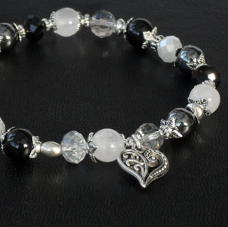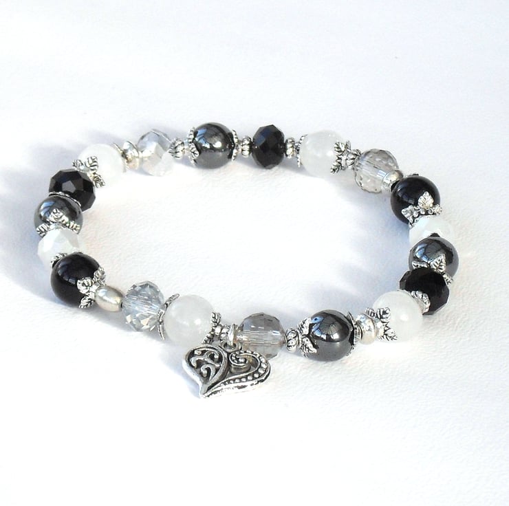 A handmade stretchy bracelet, using gemstones and crystals and completed with an exquisite heart charm.