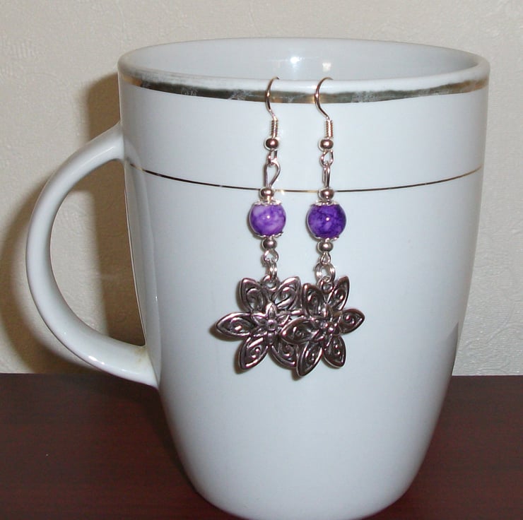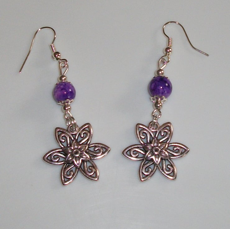 Pretty silver Flower charms set with purple marbled drawbench beads with silver spacers hung on silver fish hooks.