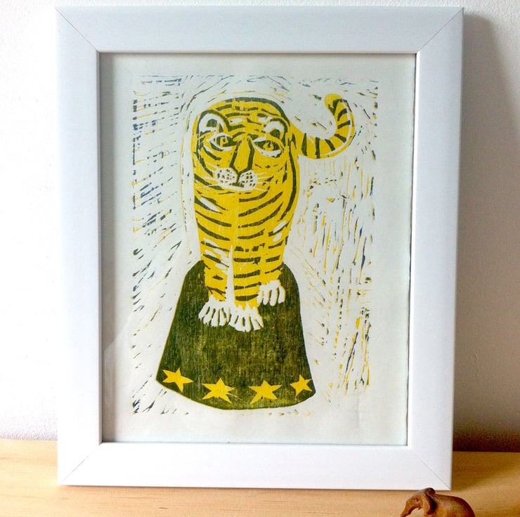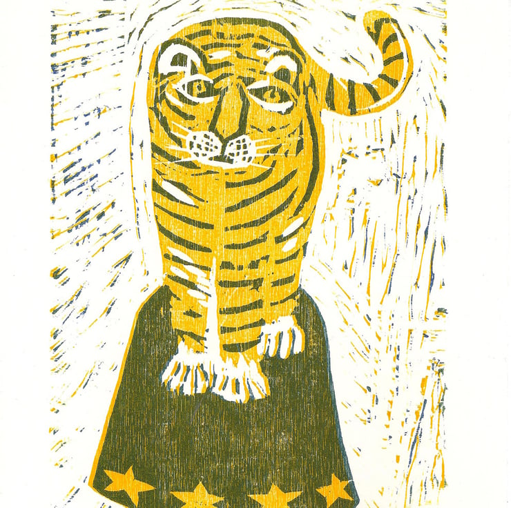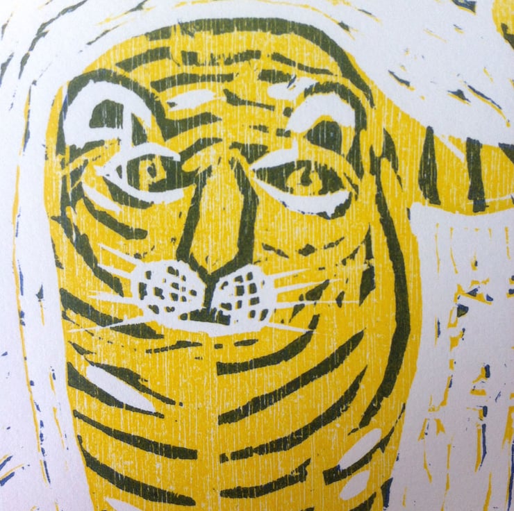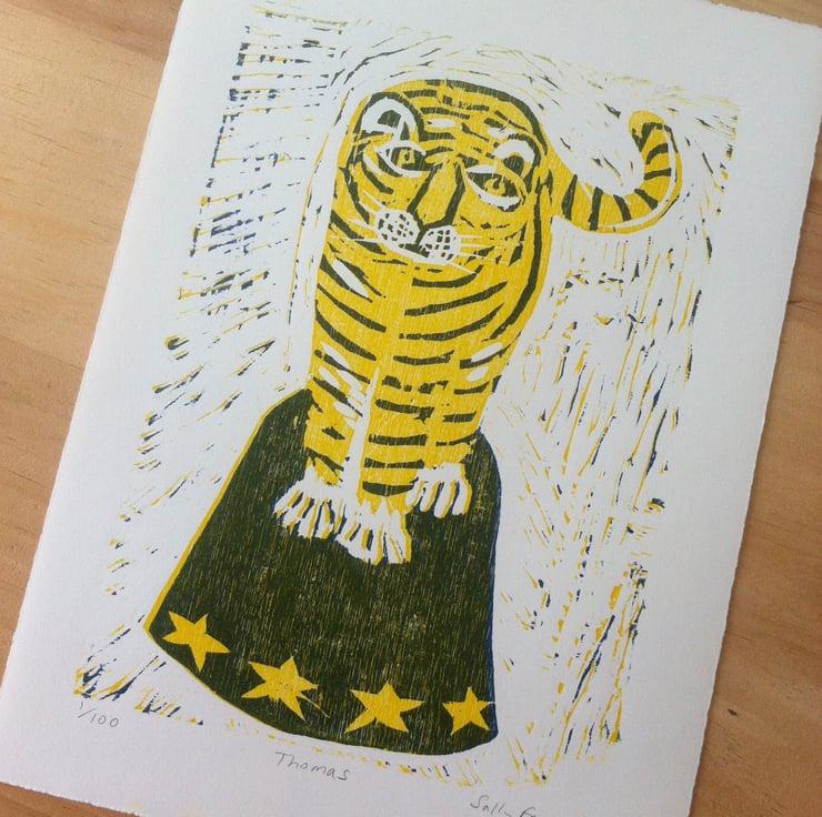He is a 2 colour reduction woodcut. Firstly I print the yellow, and then remove more wood from the plate (all the bits except the blue bits) then print again. Each colour is printed separately on a press on to high quality paper.