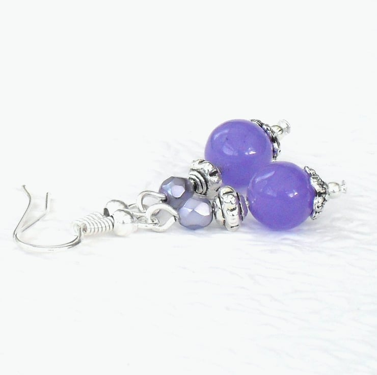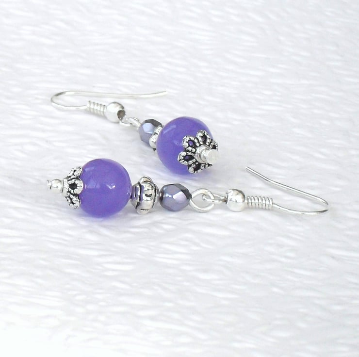 Pretty purple alexandrite 8 mm gemstone beads hang on silver plated wires with smaller lilac crystals. I have added a pretty ornate tibetan silver bead and beadcap to add extra detail to these one-of-a-kind earrings.