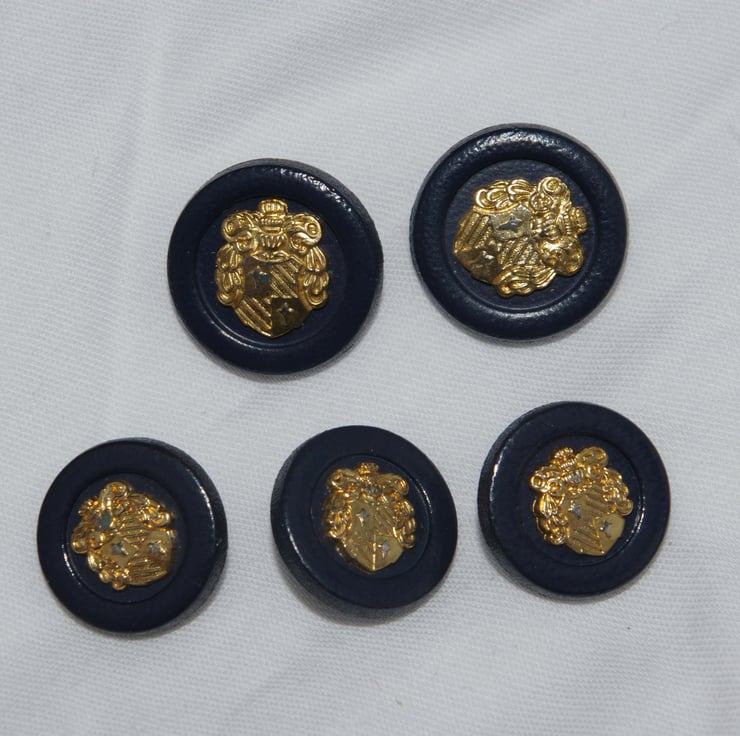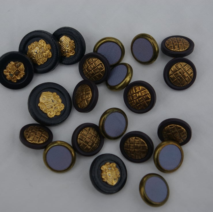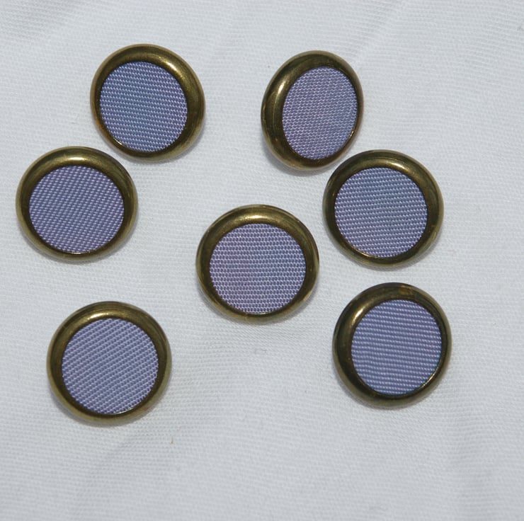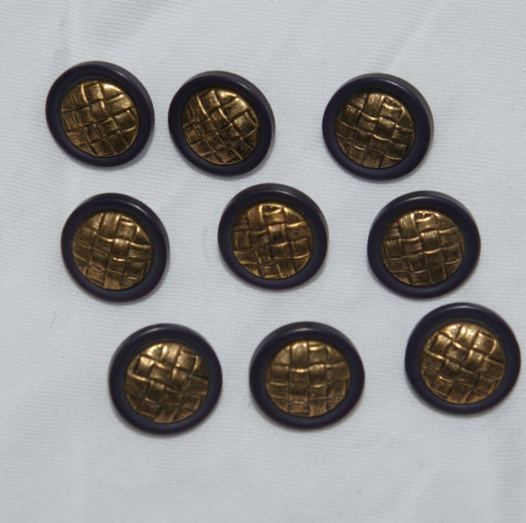 This is a mixed bag of Vintage Buttons in blue’s and gold. There are three different sets of buttons in this group. The buttons are a mix of plastic and metal. There are twenty-one buttons altogether. Each button has a gold coloured shank loop for sewing.