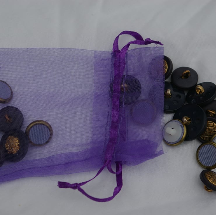 The buttons come packed into a little purple organza bag.