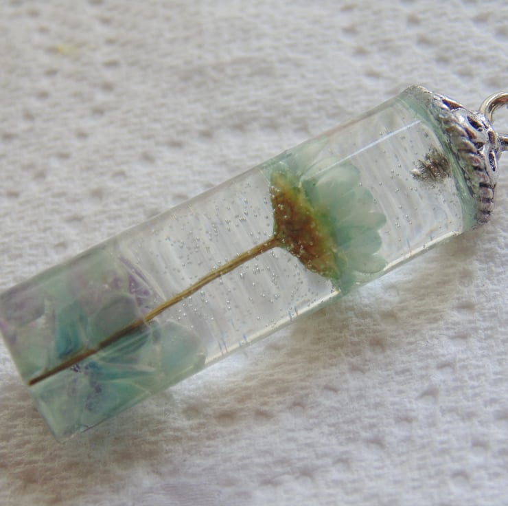 Description: I added this pretty mint blue daisy along with fluorite gemstones to UV resistant, non toxic eco friendly clear resin, took me days of layering the resin to achieve this result This tube shape measures around 35mm x 10mm, I have capped with a pretty silver cab and hung on a delicate sterling silver 18" chain