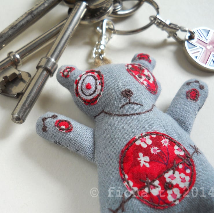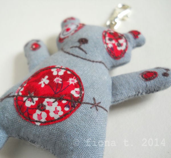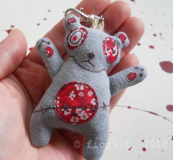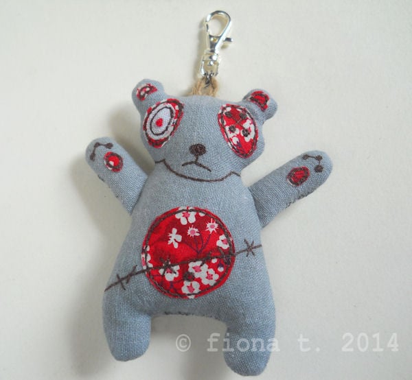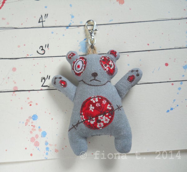 this deadly cute miniature fabric zombie panda measures about 8cm (3 inches) tall from the tips of his ears to the bottom of his shuffling toes. he hangs from a 23mm bag charm clip, attached to a twine loop which has been securely stitched.