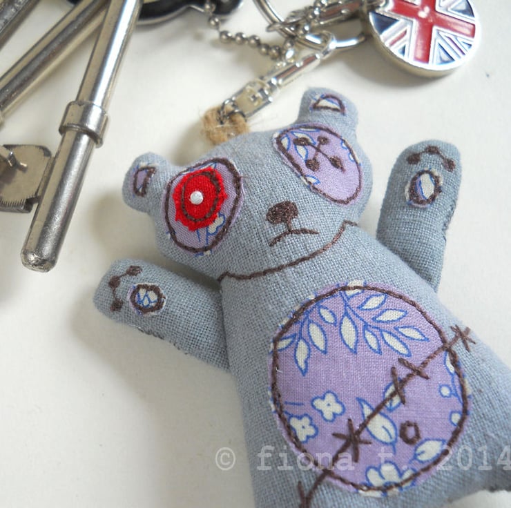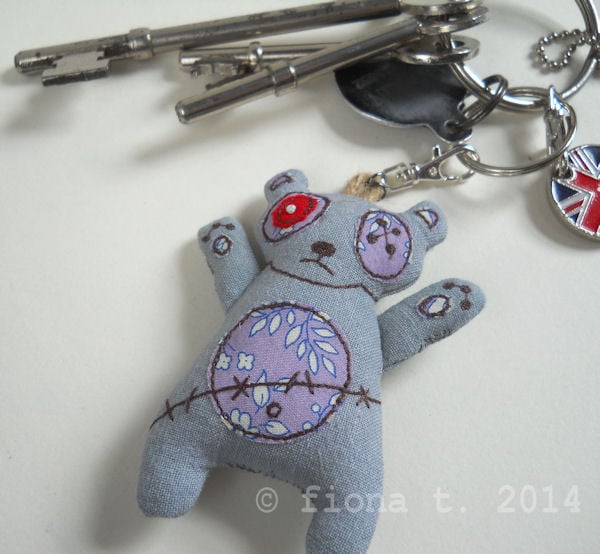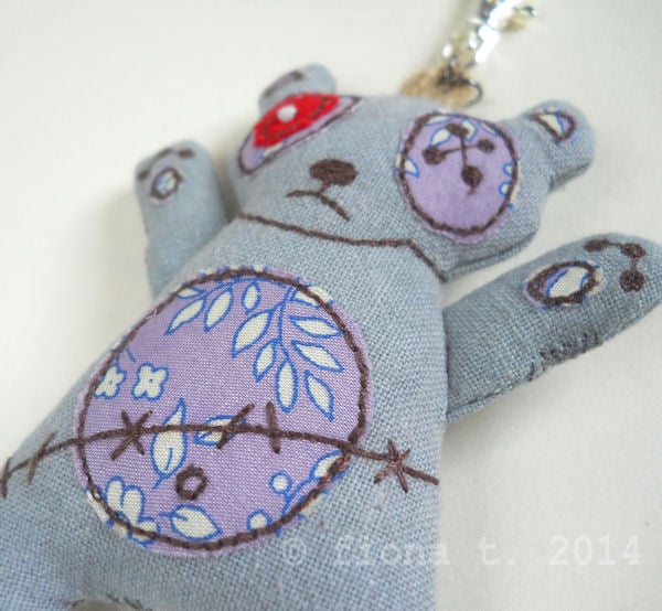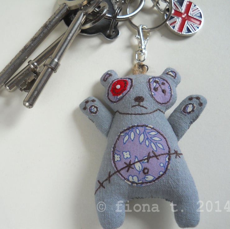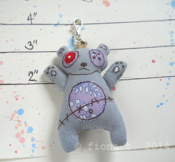 this deadly cute miniature fabric zombie panda measures about 8cm (3 inches) tall from the tips of his ears to the bottom of his shuffling toes. he hangs from a 23mm bag charm clip, attached to a twine loop which has been securely stitched.