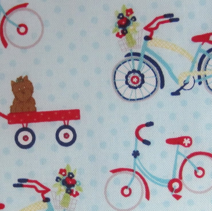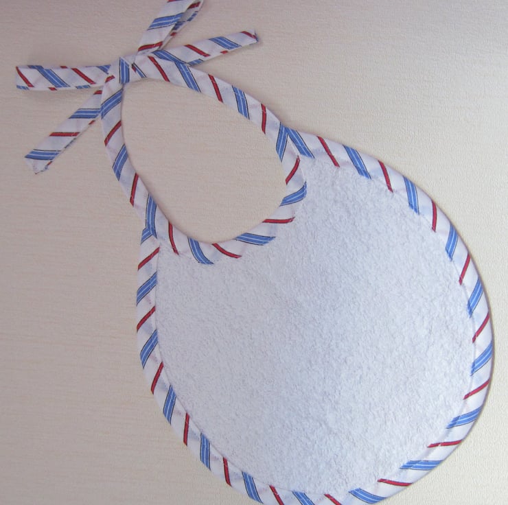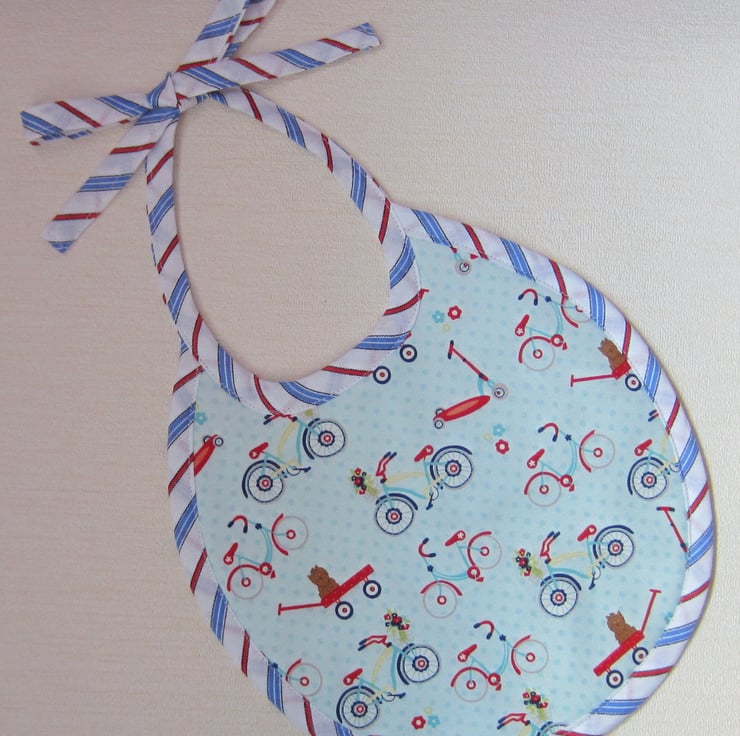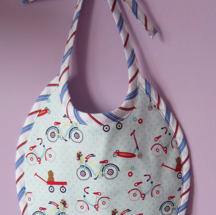First size bib in bicycle fabric edged with red, blue and white striped bias binding and backed with white towelling. Suitable for babies, newborn to aged about 6 months. Measures 20.5 cm wide and 23 cm long. Ties with a bow at neck.